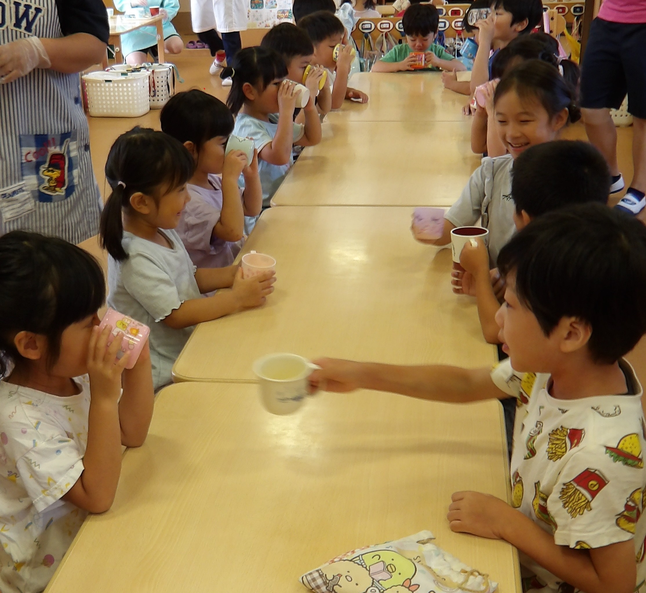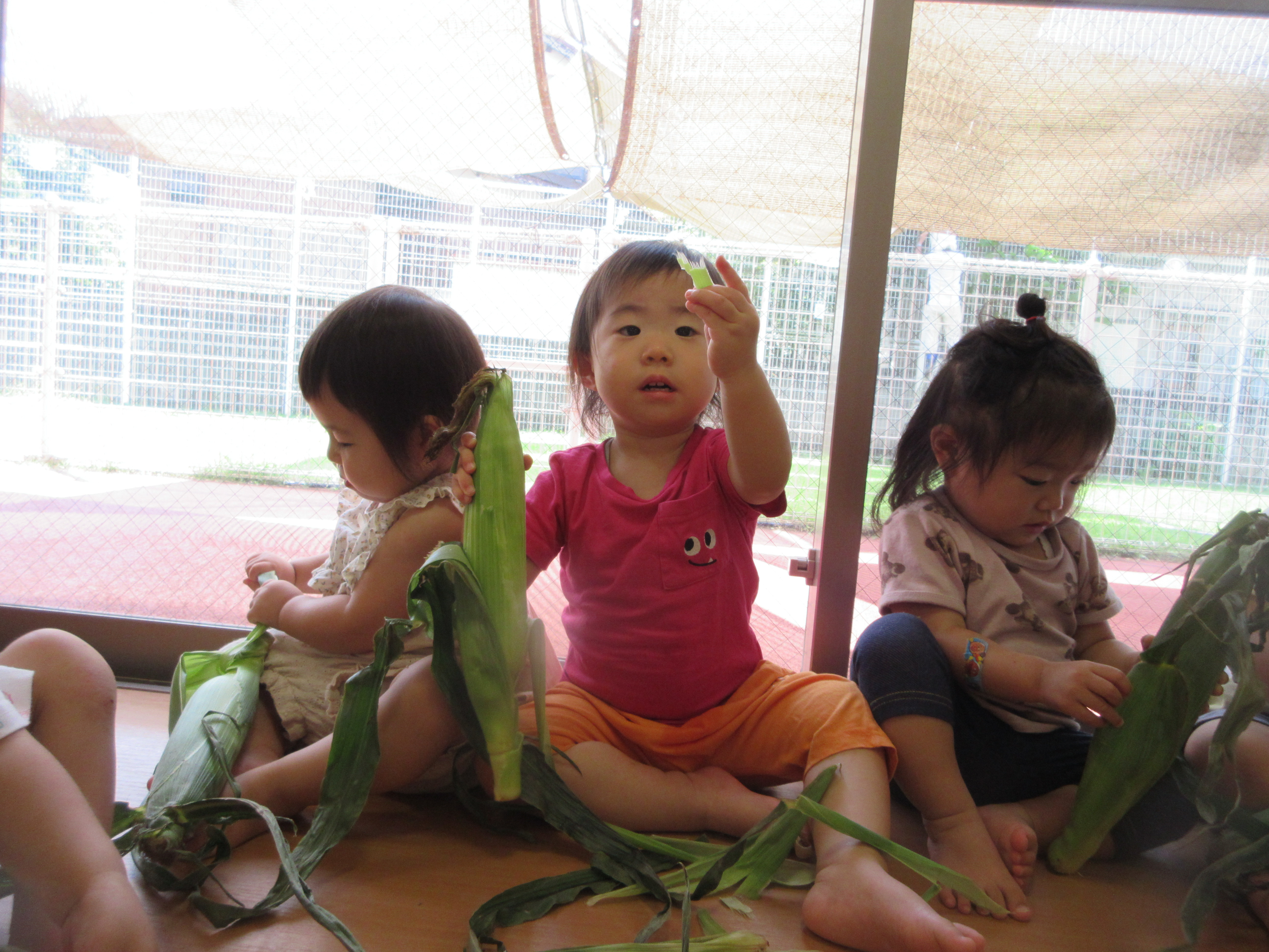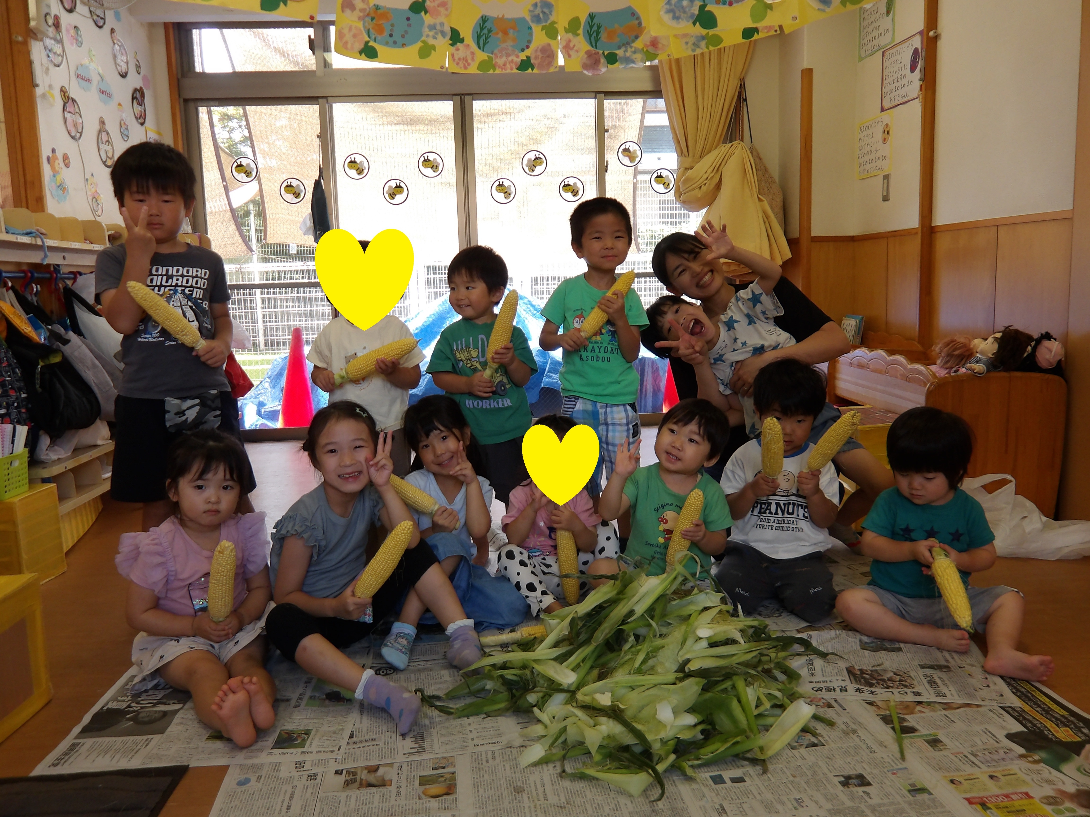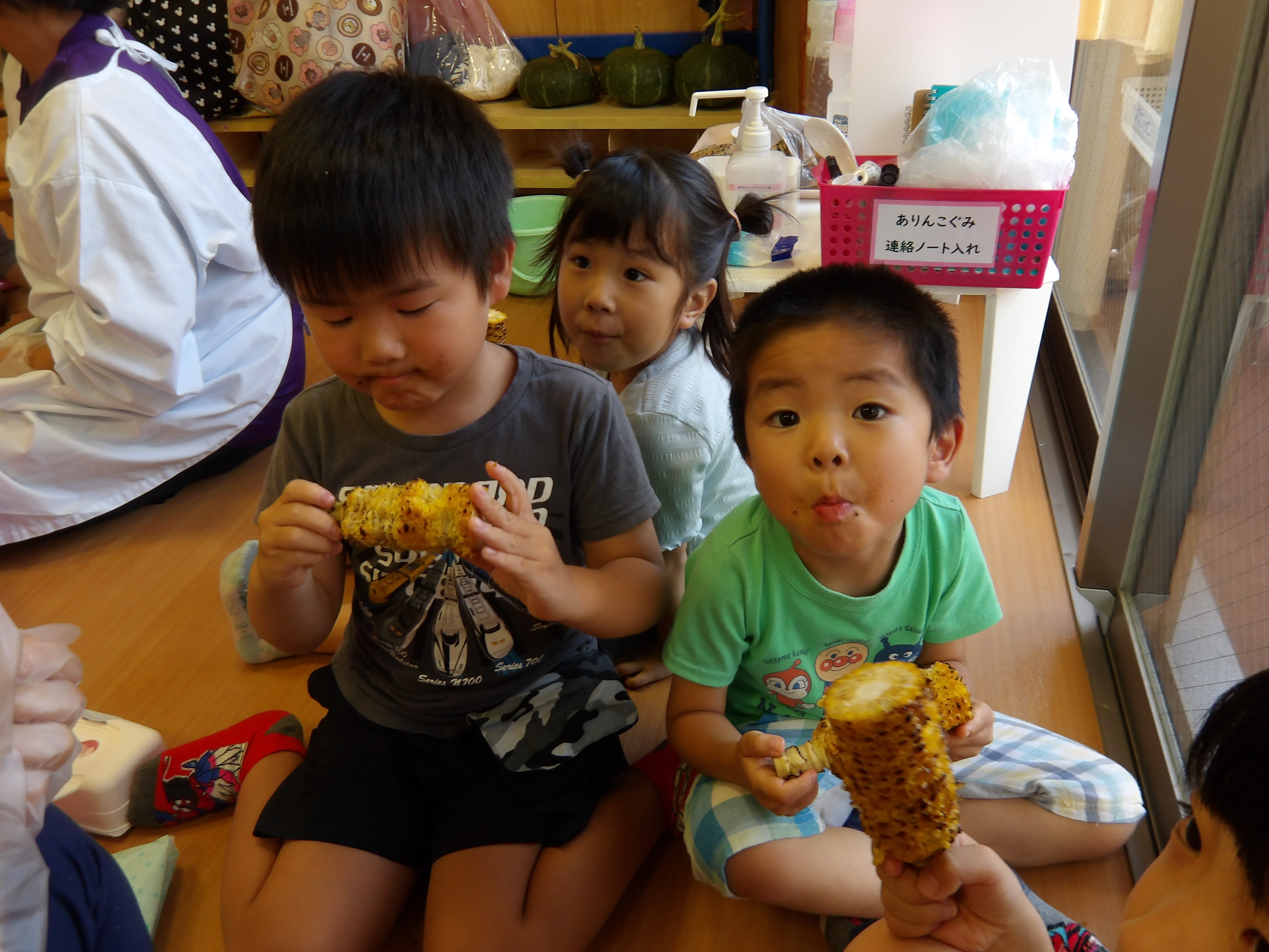 「コーンちゃん」は子どもたちに1本ずつとうもろこしを持ってきてくれて、みんなで皮むき。午後のおやつでは焼きとうもろこしパーティーを楽しみました。「MJ君」はみんなで育てた野菜を使ったミックスジュースを作ってくれて、みんなで乾杯!「大豆のだいちゃん」はお味噌の天地返しのためにお豆の国から来てくれて、匂いを嗅いだり、感触を確かめたりして完成への期待が膨らみました。
