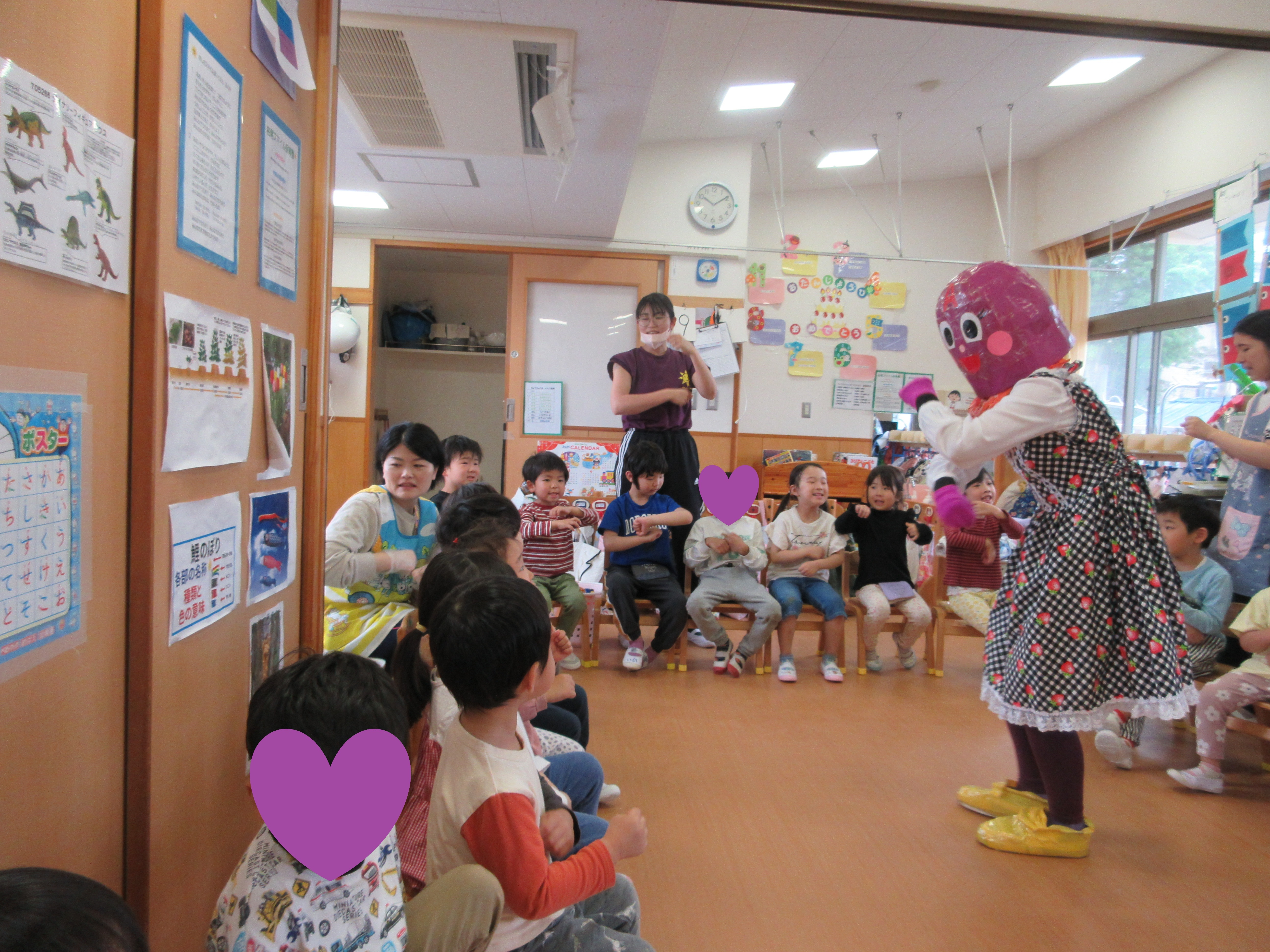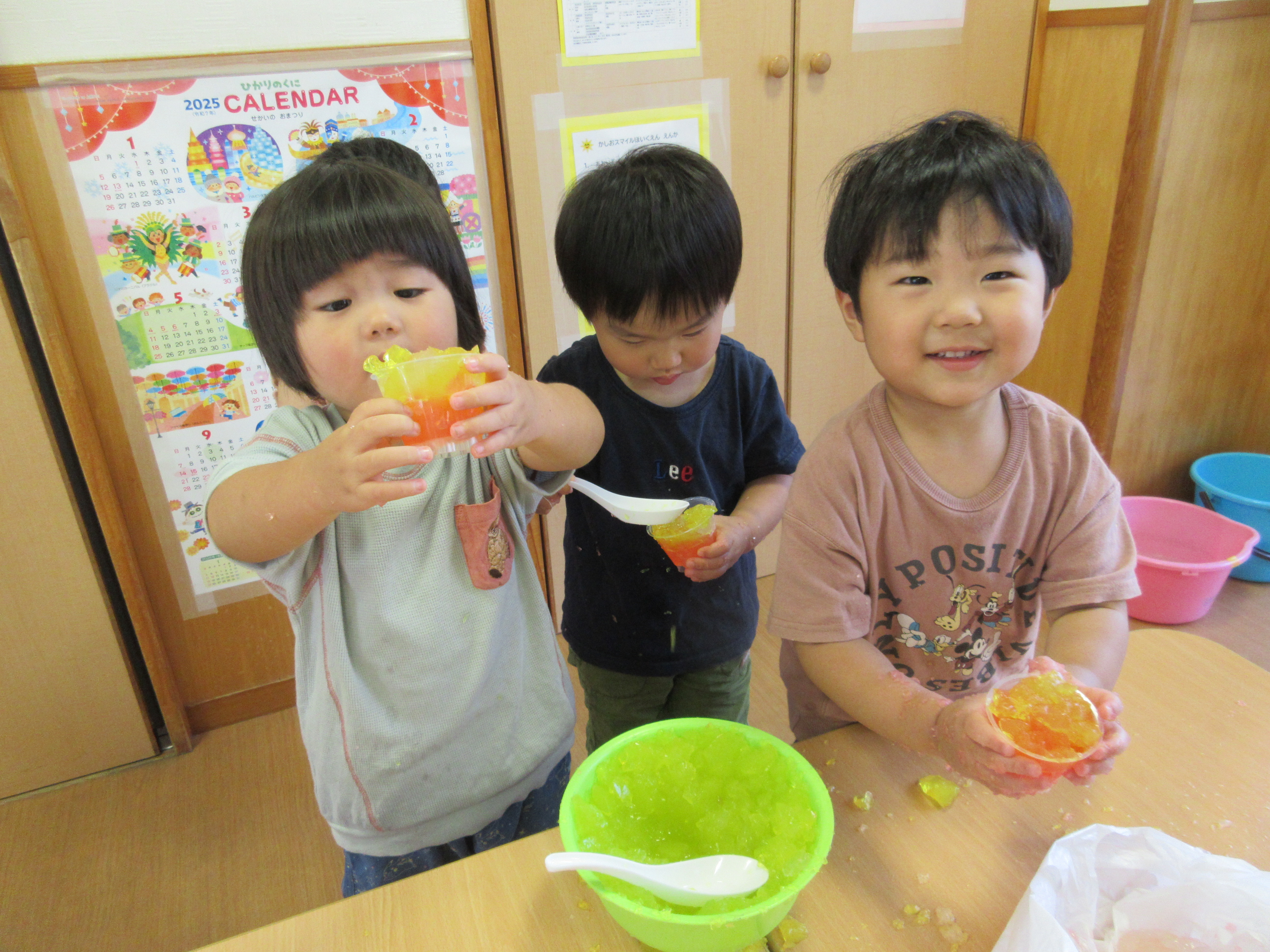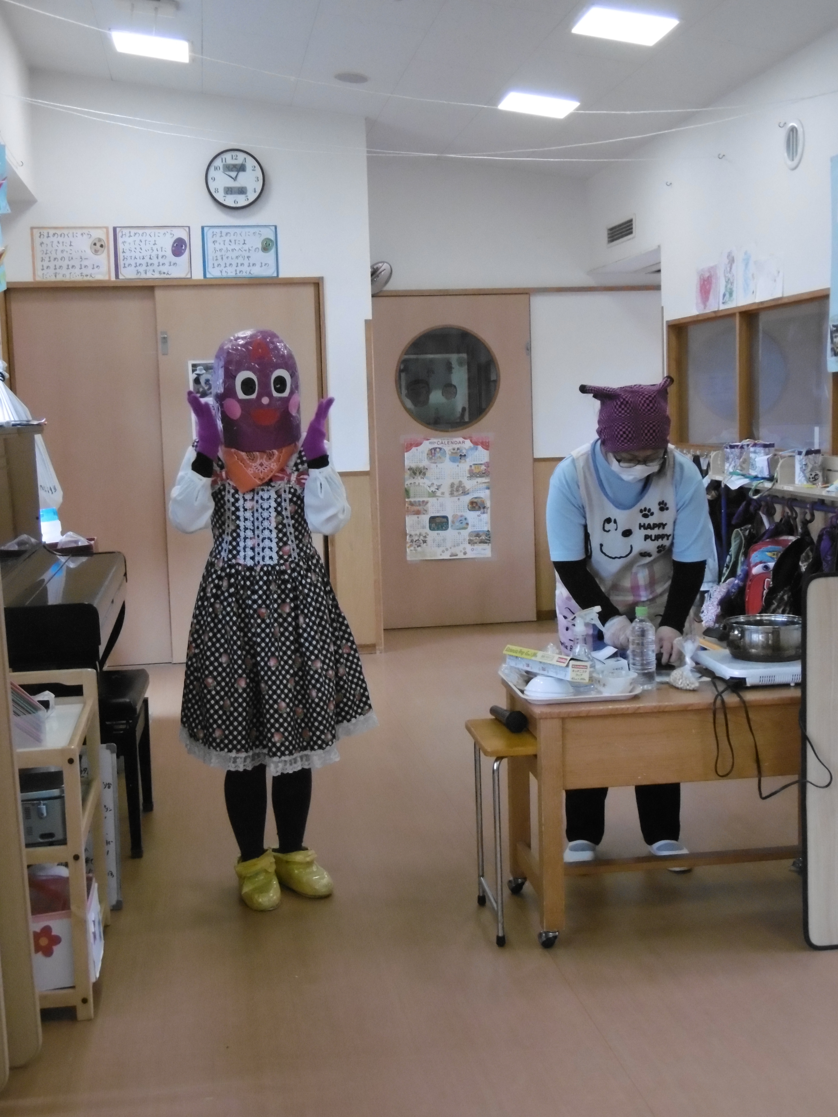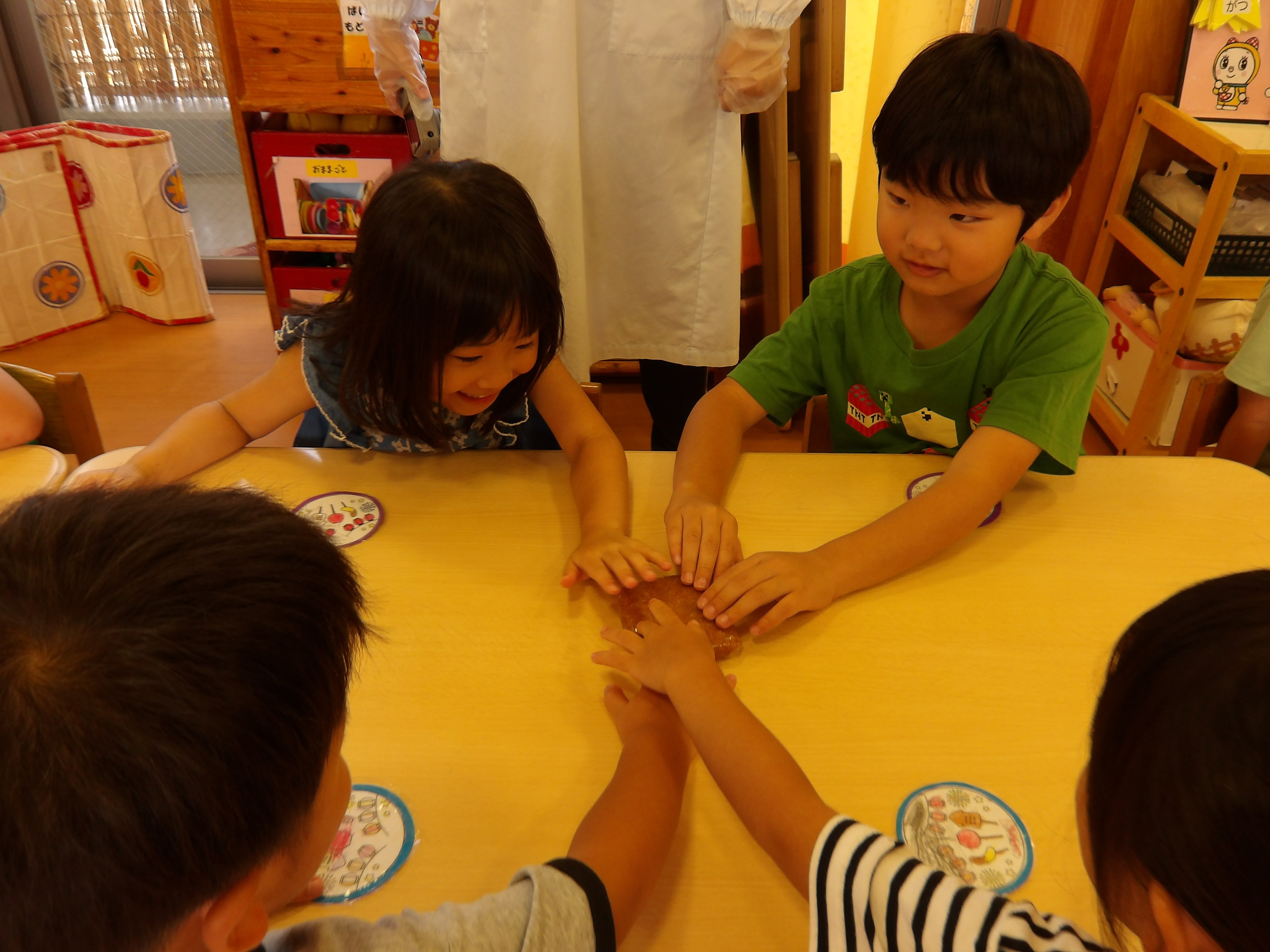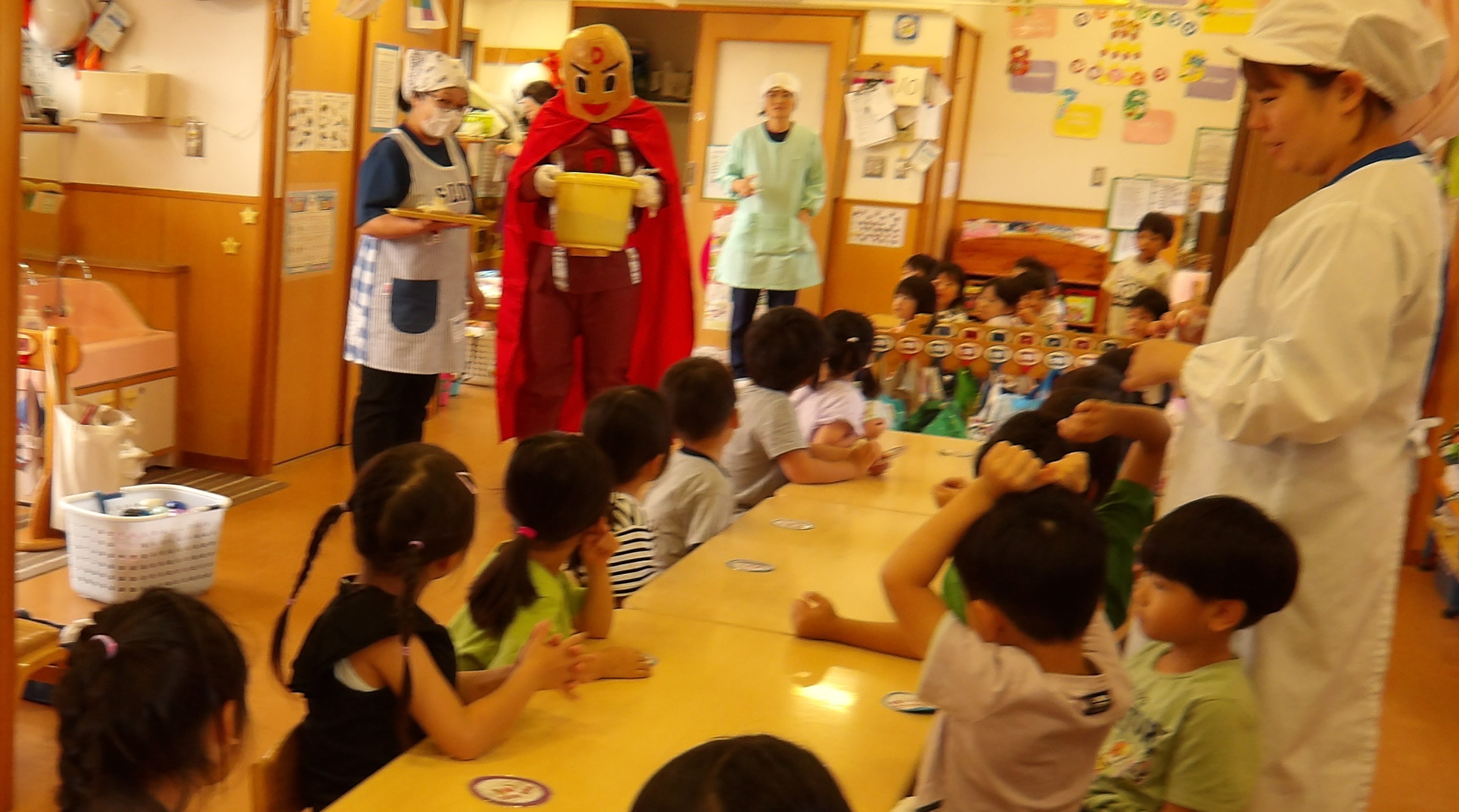 「コーンちゃん」は子どもたちに1本ずつとうもろこしを持ってきてくれて、みんなで皮むき。午後のおやつでは焼きとうもろこしパーティーを楽しみました。「MJ君」はみんなで育てた野菜を使ったミックスジュースを作ってくれて、みんなで乾杯!「大豆のだいちゃん」はお味噌の天地返しのためにお豆の国から来てくれて、匂いを嗅いだり、感触を確かめたりして完成への期待が膨らみました。