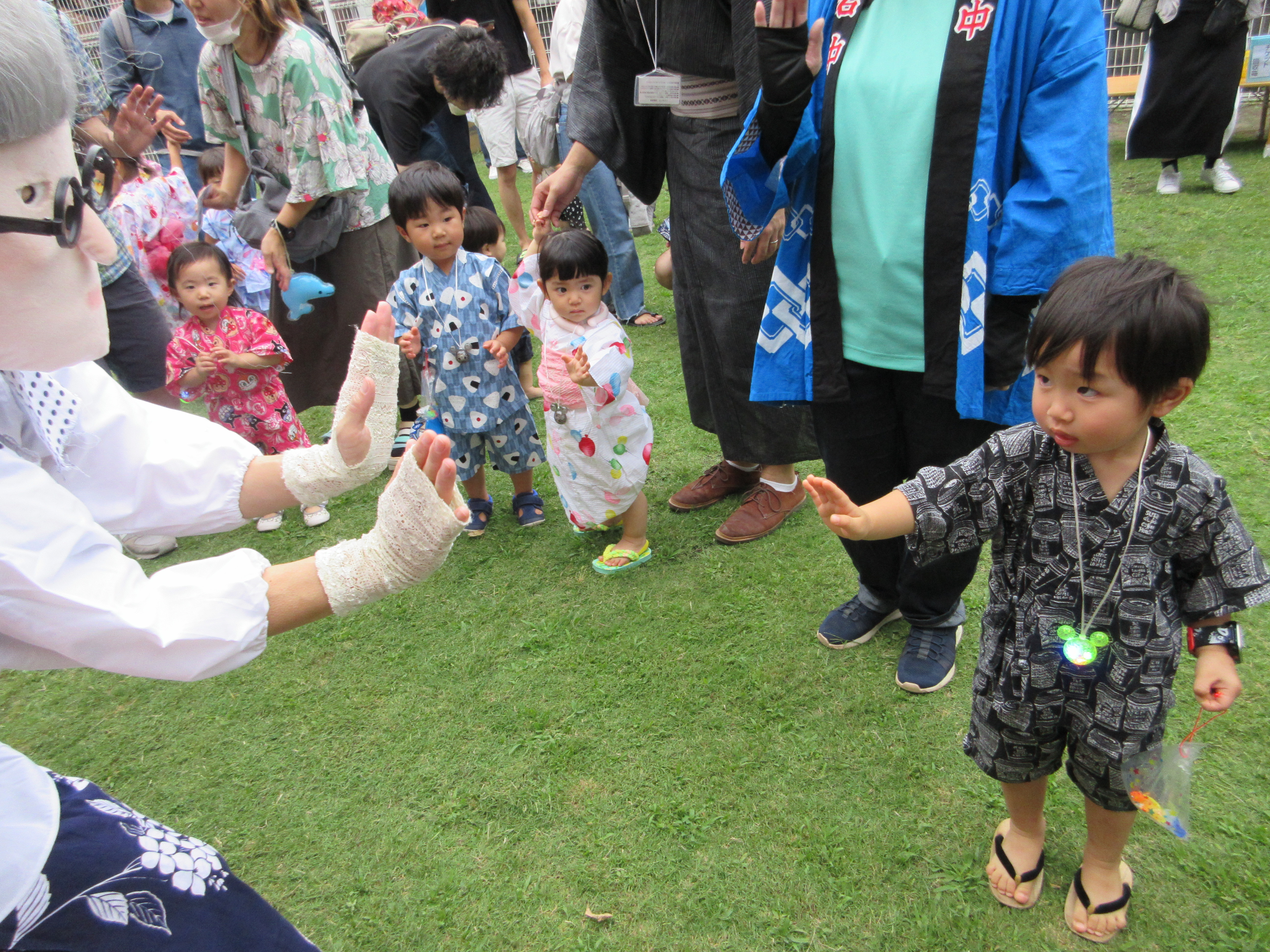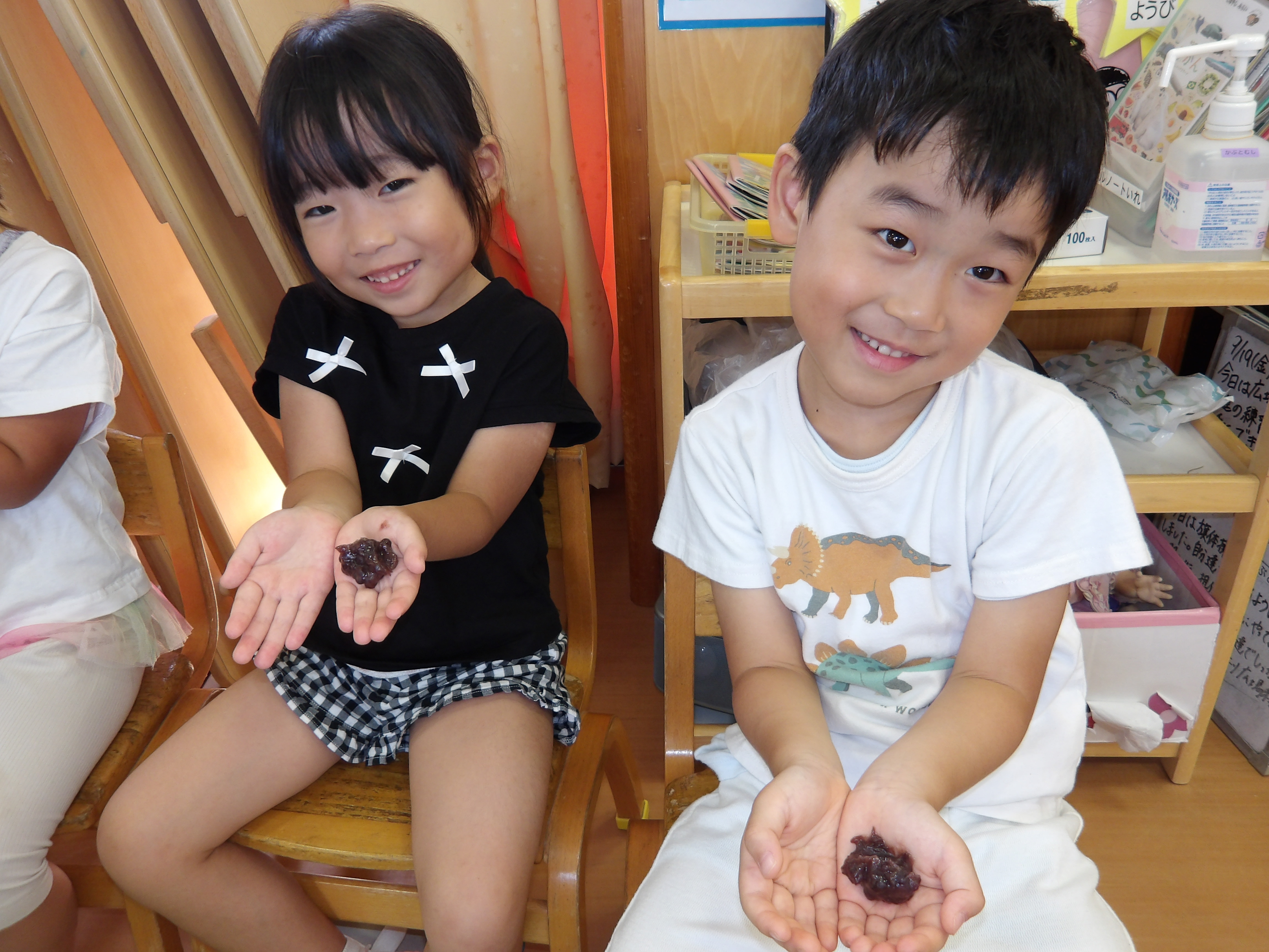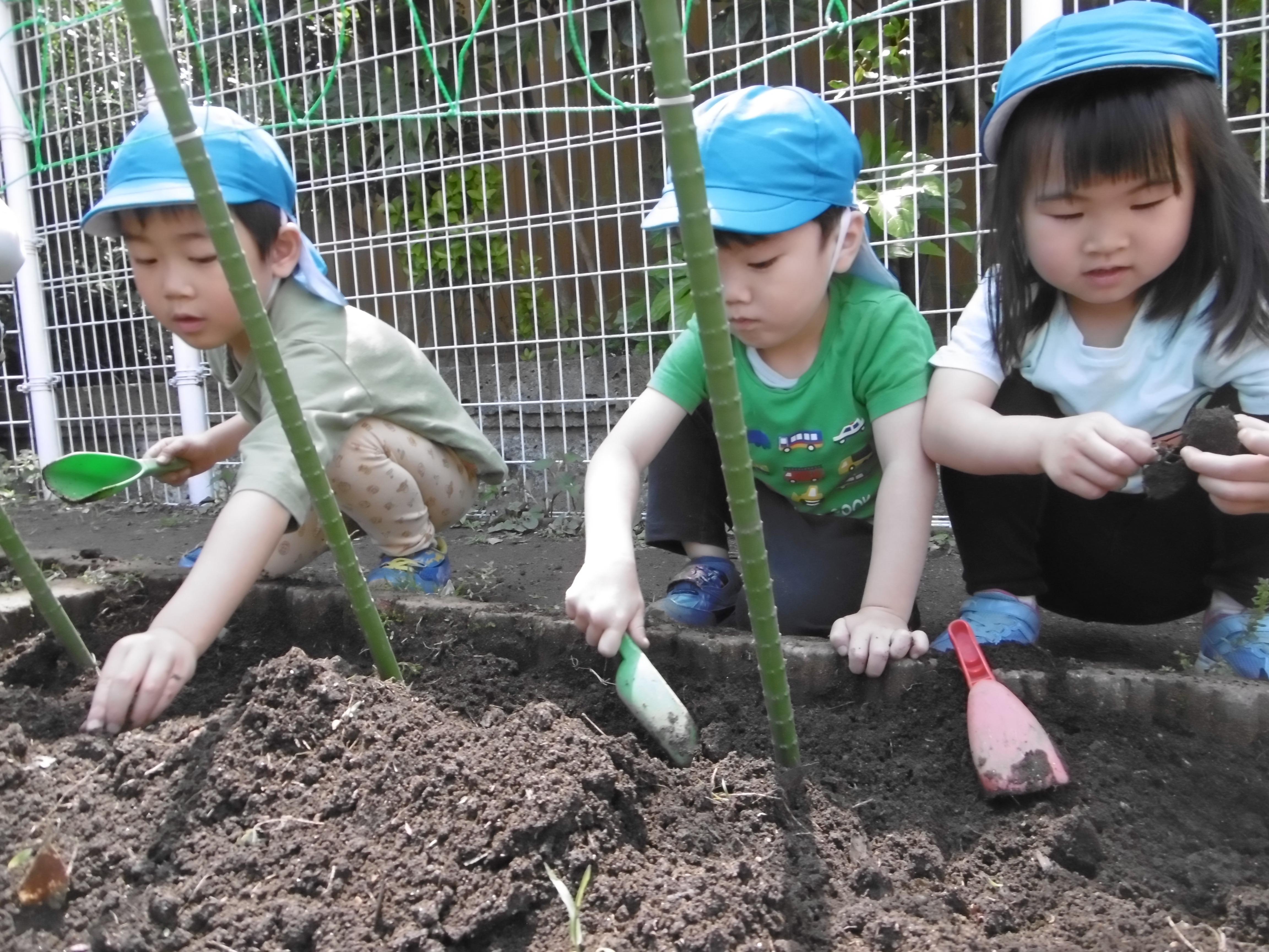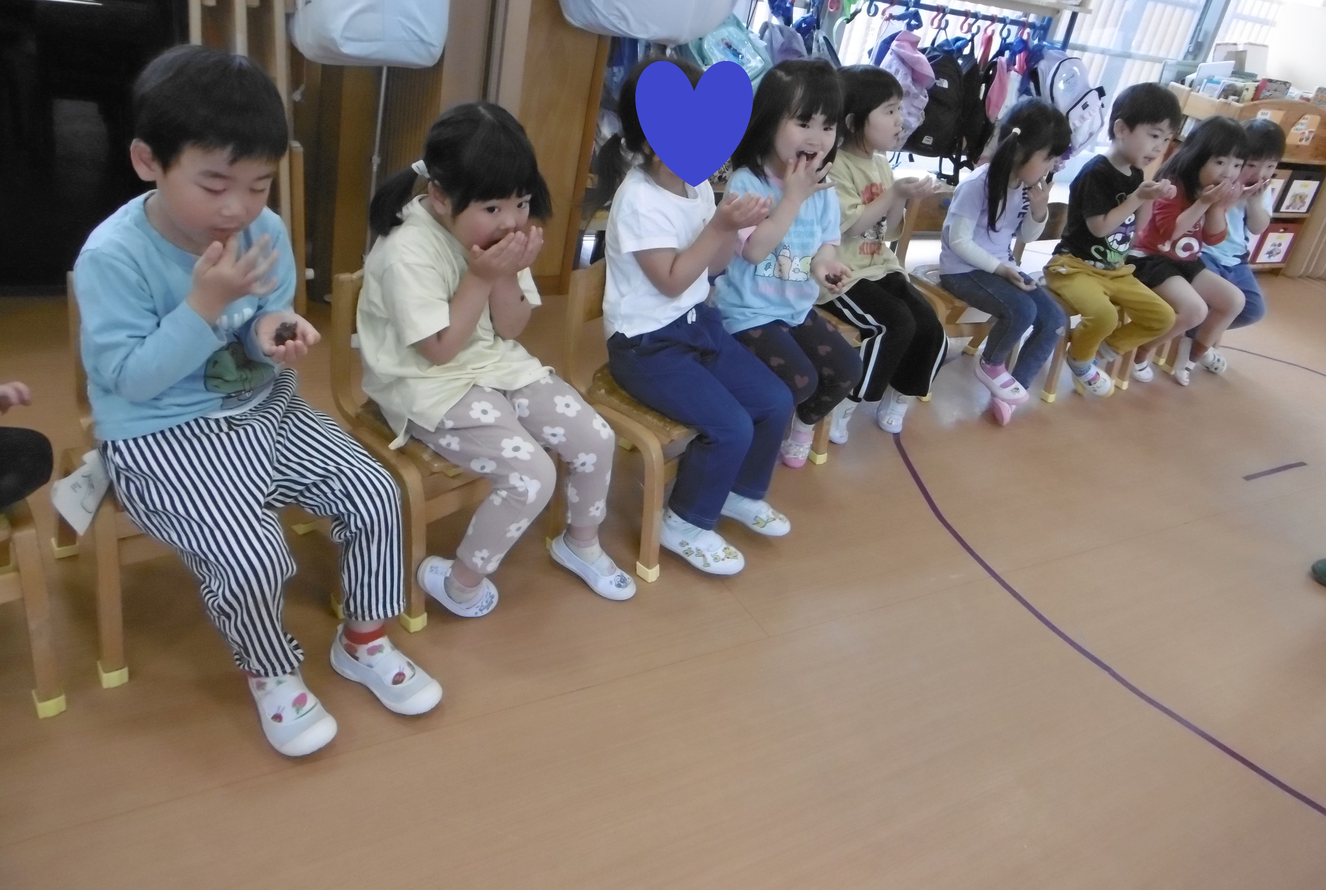「コーンちゃん」は子どもたちに1本ずつとうもろこしを持ってきてくれて、みんなで皮むき。午後のおやつでは焼きとうもろこしパーティーを楽しみました。「MJ君」はみんなで育てた野菜を使ったミックスジュースを作ってくれて、みんなで乾杯!「大豆のだいちゃん」はお味噌の天地返しのためにお豆の国から来てくれて、匂いを嗅いだり、感触を確かめたりして完成への期待が膨らみました。