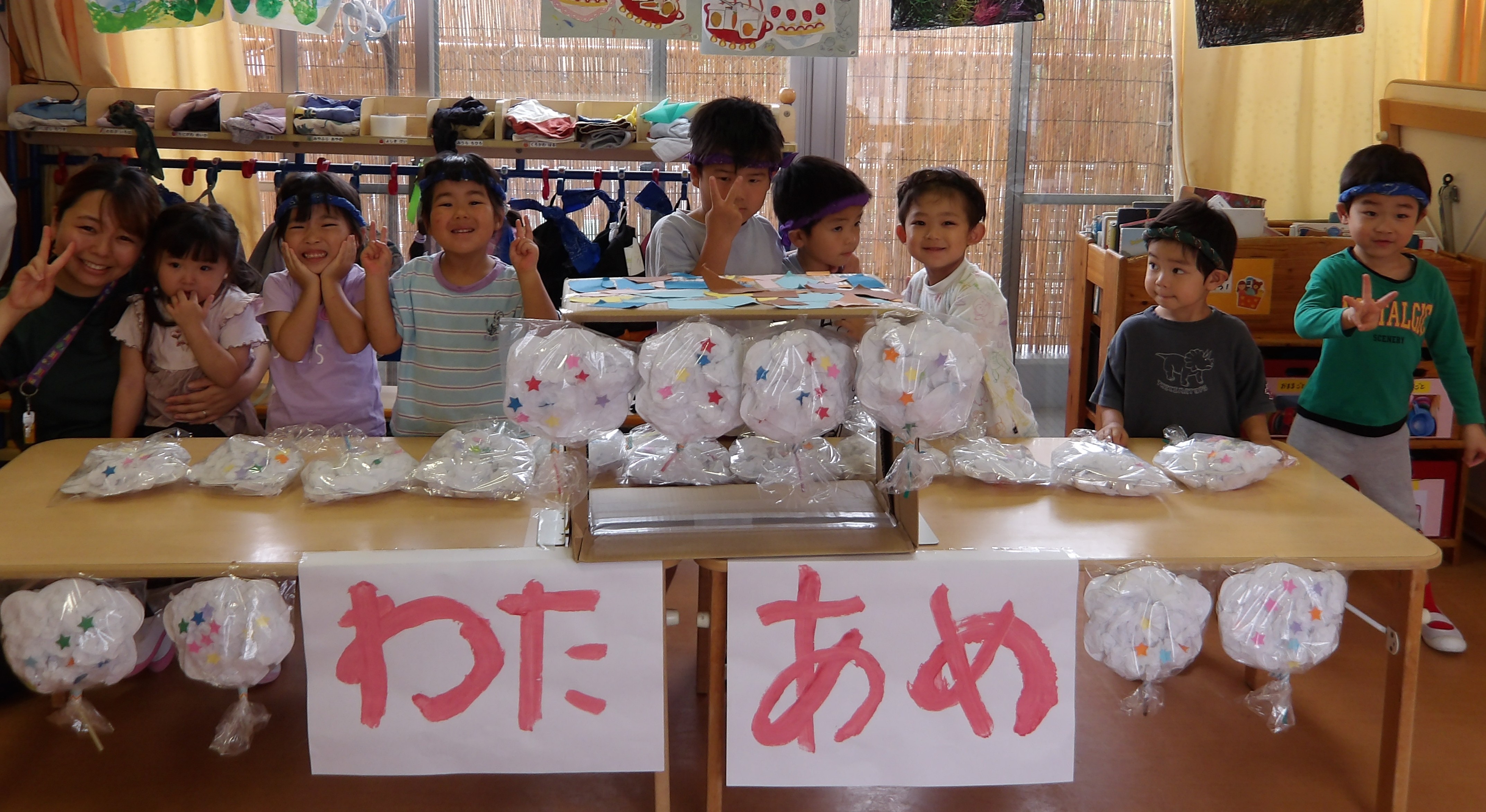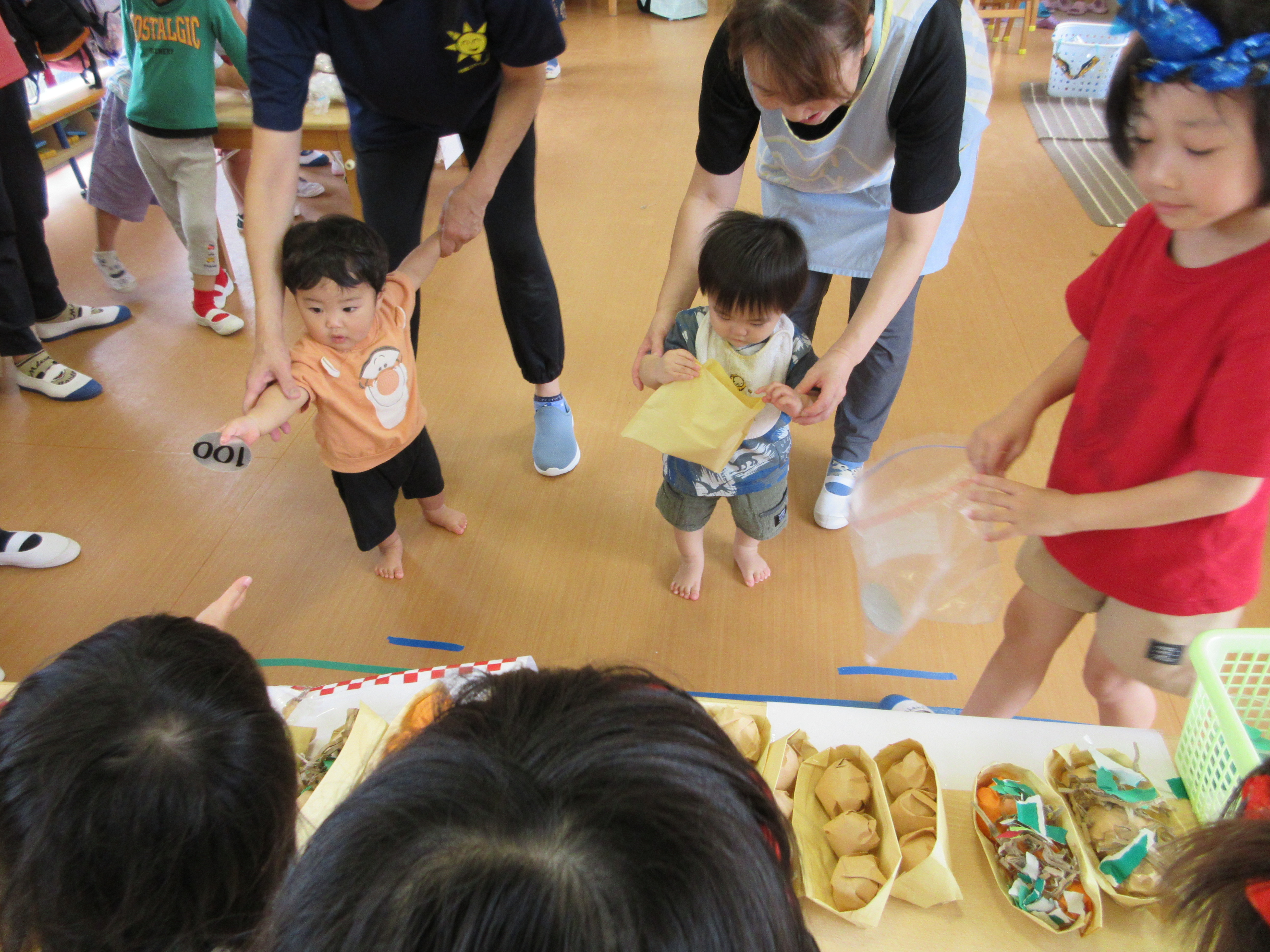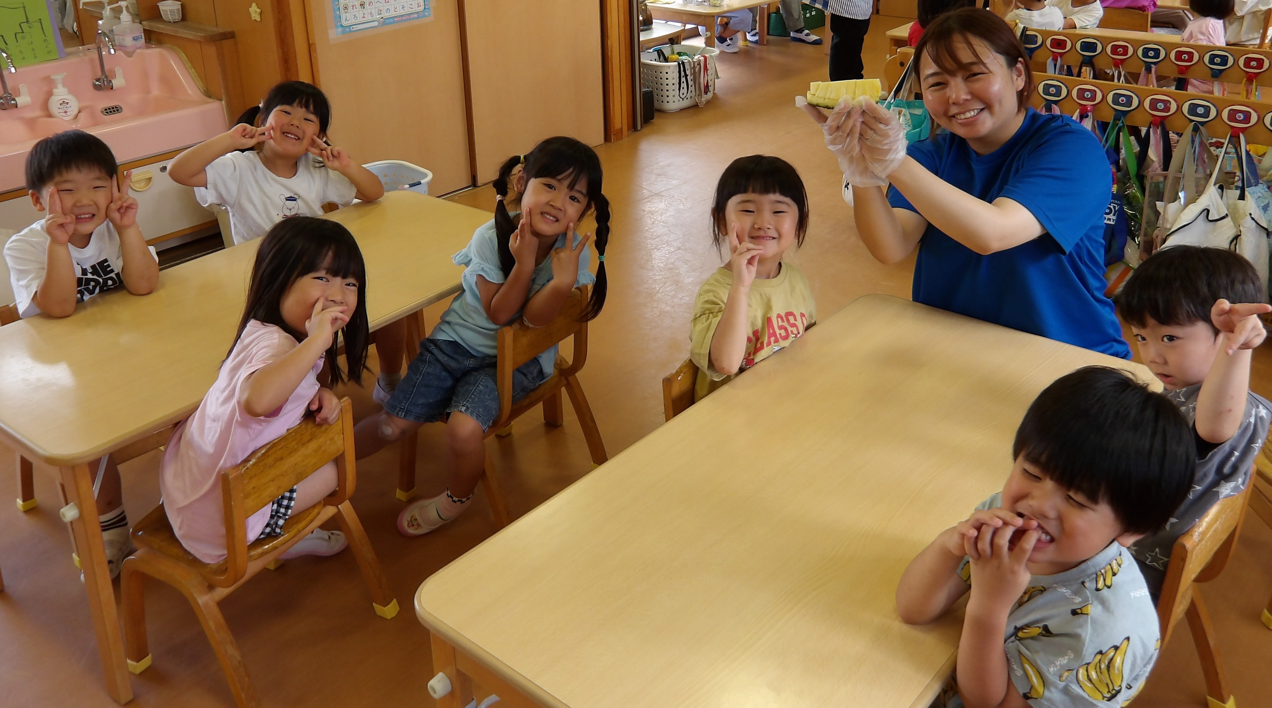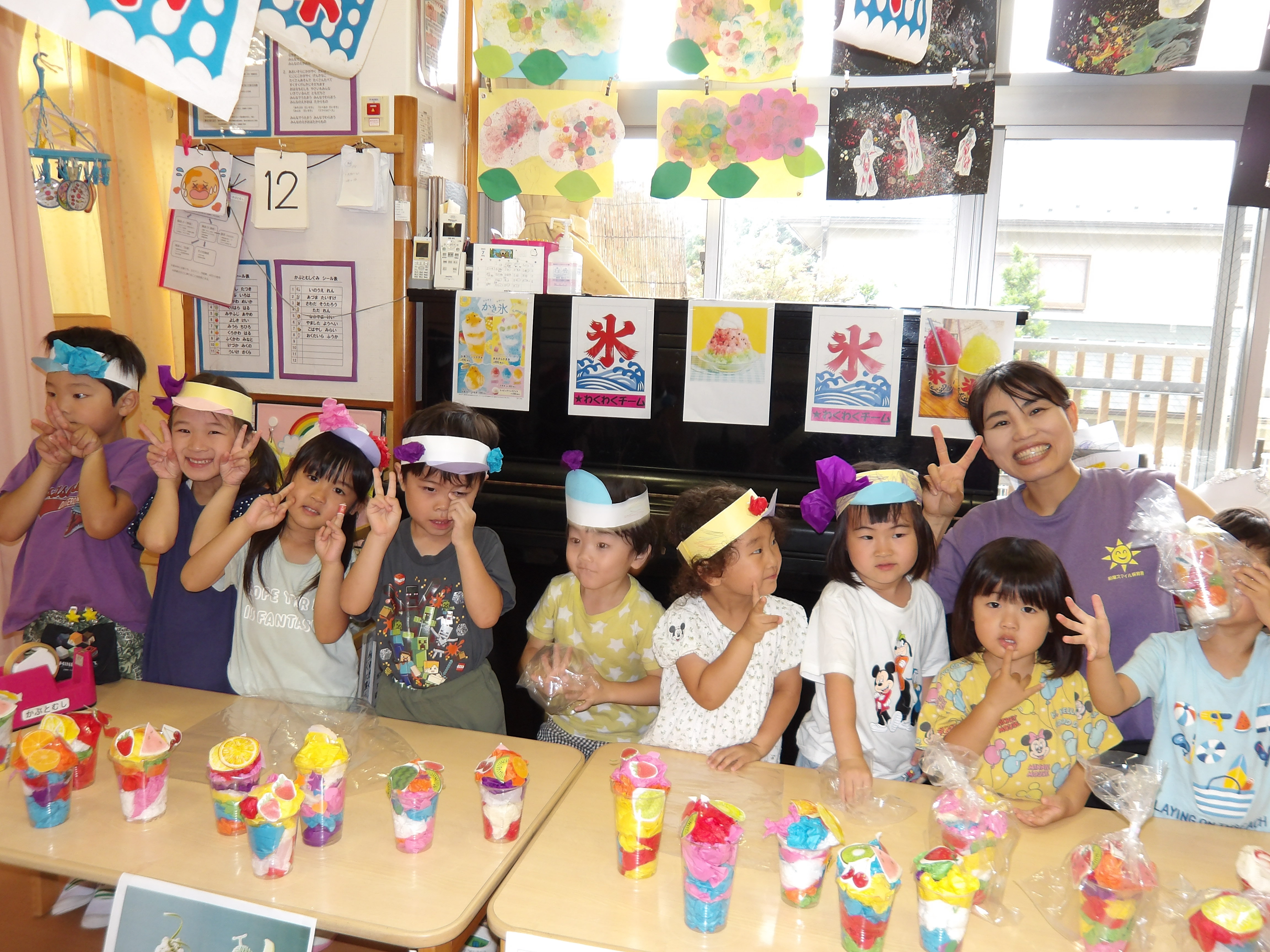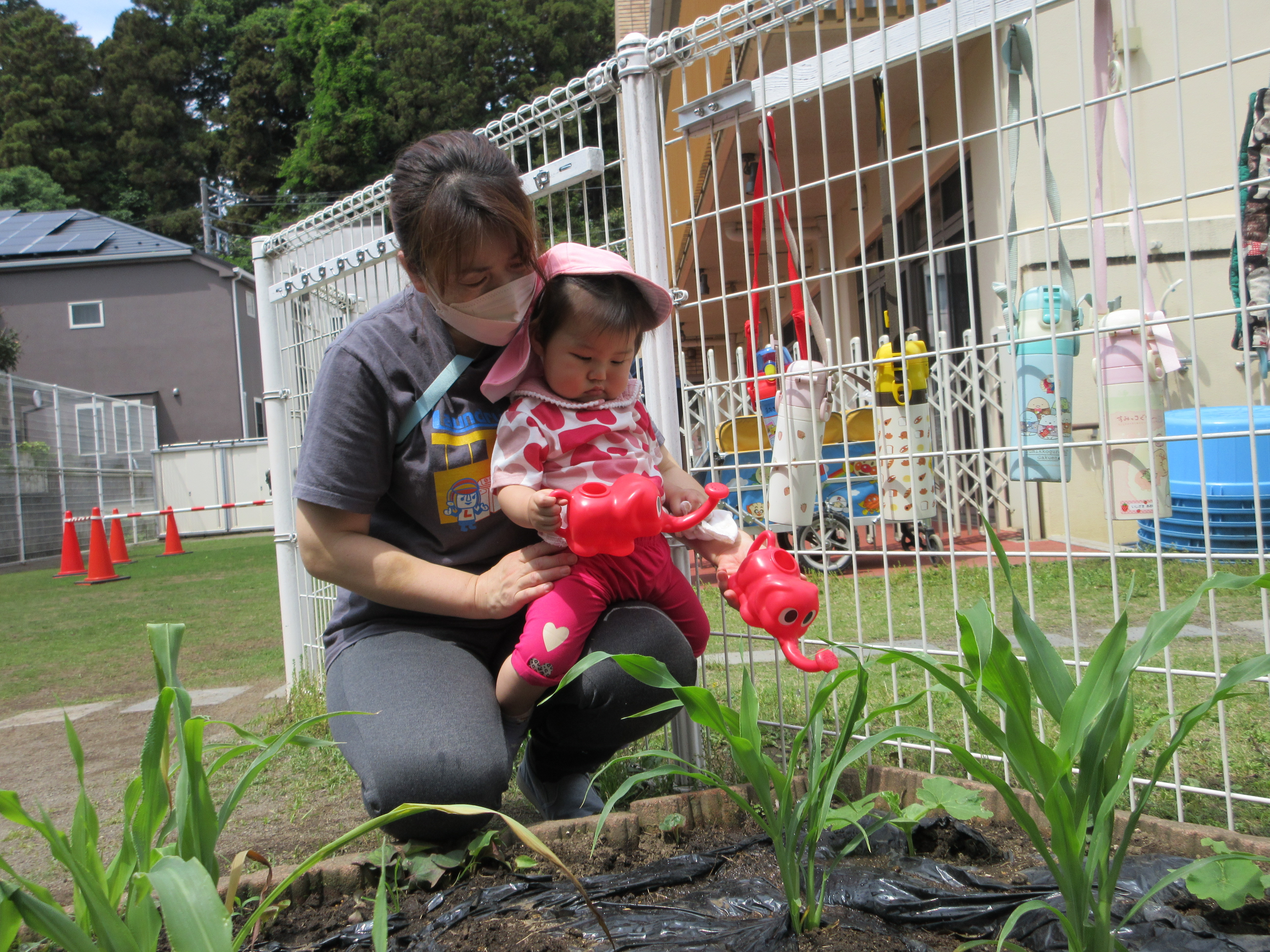 「コーンちゃん」は子どもたちに1本ずつとうもろこしを持ってきてくれて、みんなで皮むき。午後のおやつでは焼きとうもろこしパーティーを楽しみました。「MJ君」はみんなで育てた野菜を使ったミックスジュースを作ってくれて、みんなで乾杯!「大豆のだいちゃん」はお味噌の天地返しのためにお豆の国から来てくれて、匂いを嗅いだり、感触を確かめたりして完成への期待が膨らみました。