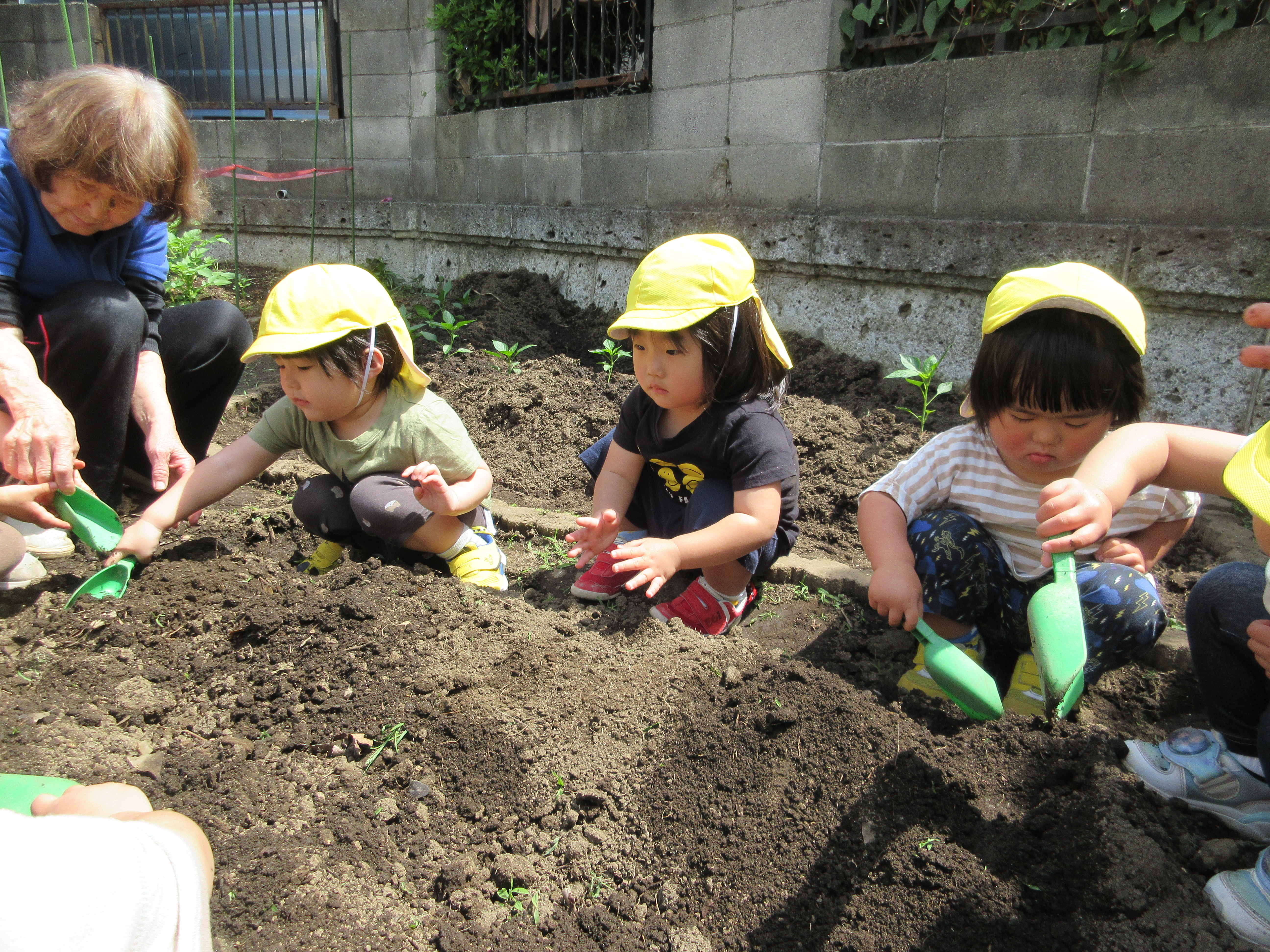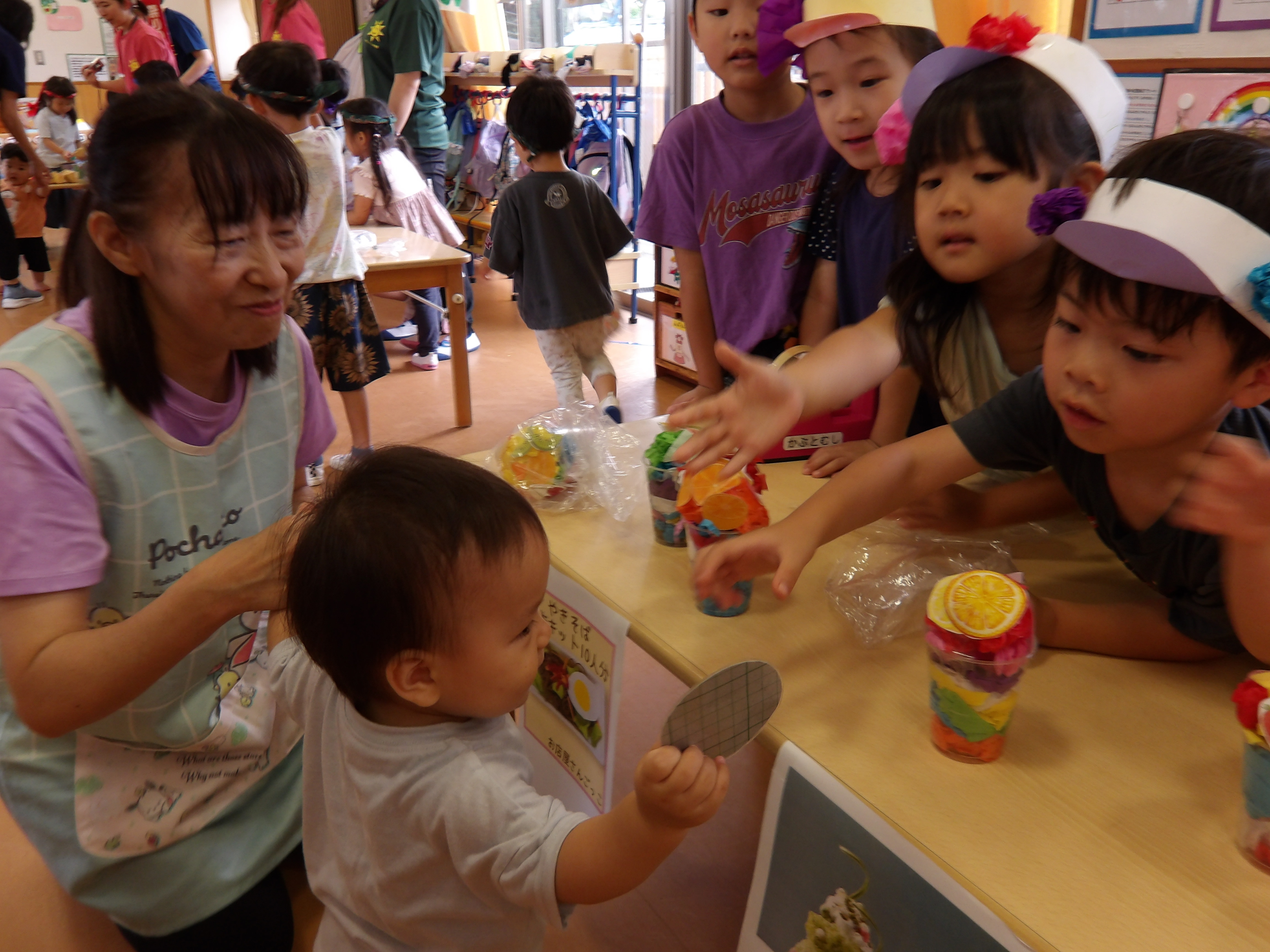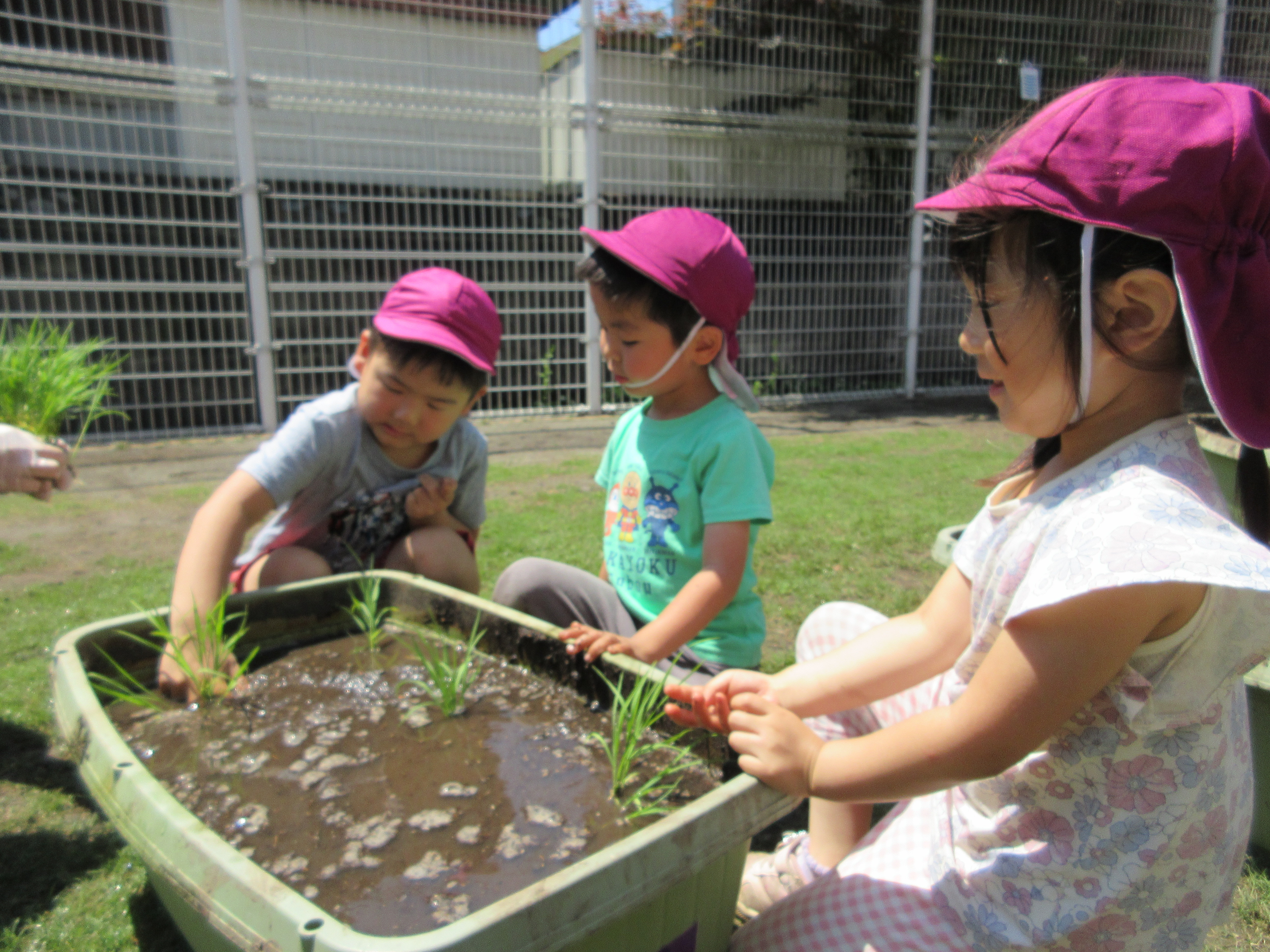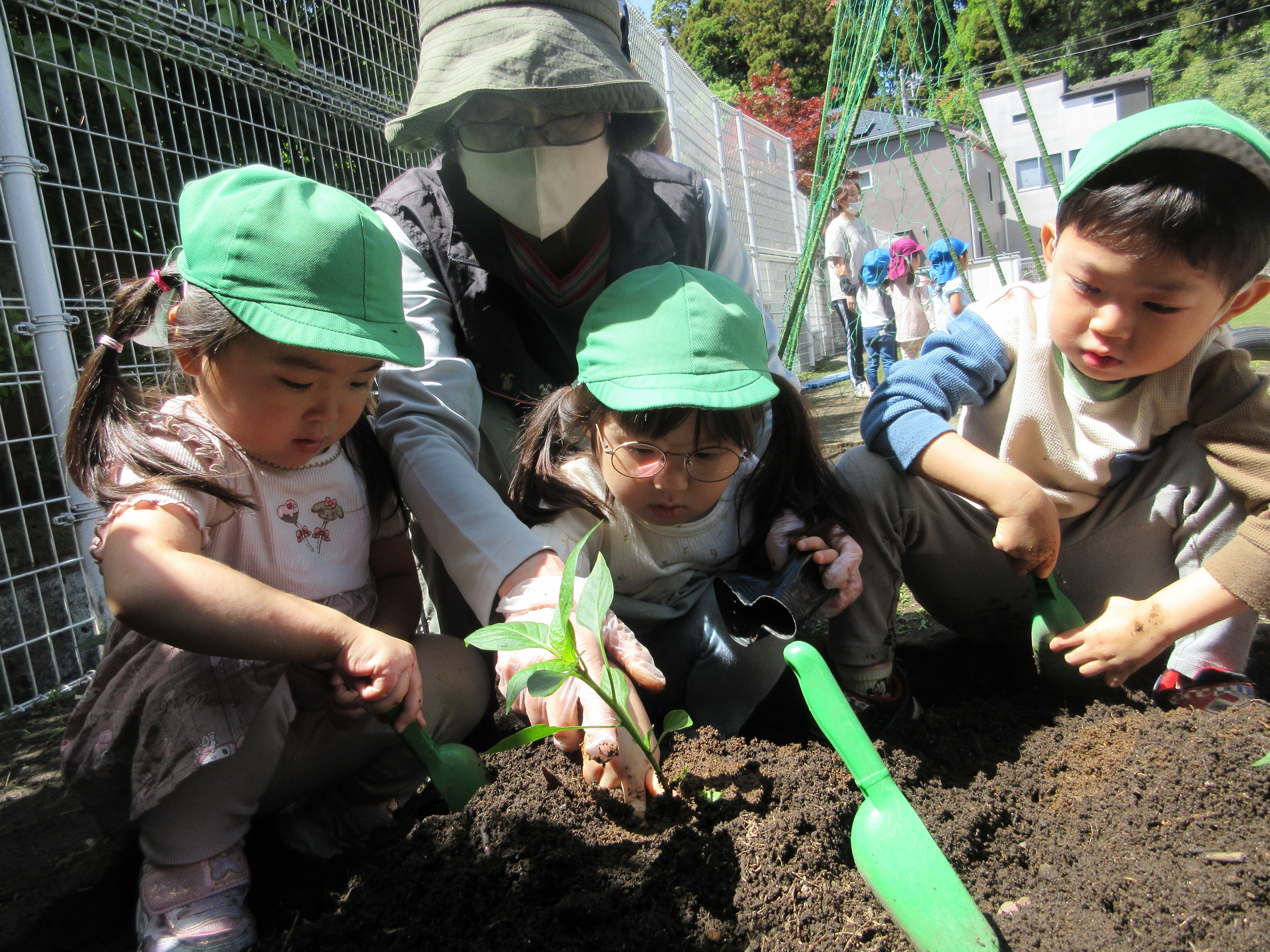 「コーンちゃん」は子どもたちに1本ずつとうもろこしを持ってきてくれて、みんなで皮むき。午後のおやつでは焼きとうもろこしパーティーを楽しみました。「MJ君」はみんなで育てた野菜を使ったミックスジュースを作ってくれて、みんなで乾杯!「大豆のだいちゃん」はお味噌の天地返しのためにお豆の国から来てくれて、匂いを嗅いだり、感触を確かめたりして完成への期待が膨らみました。