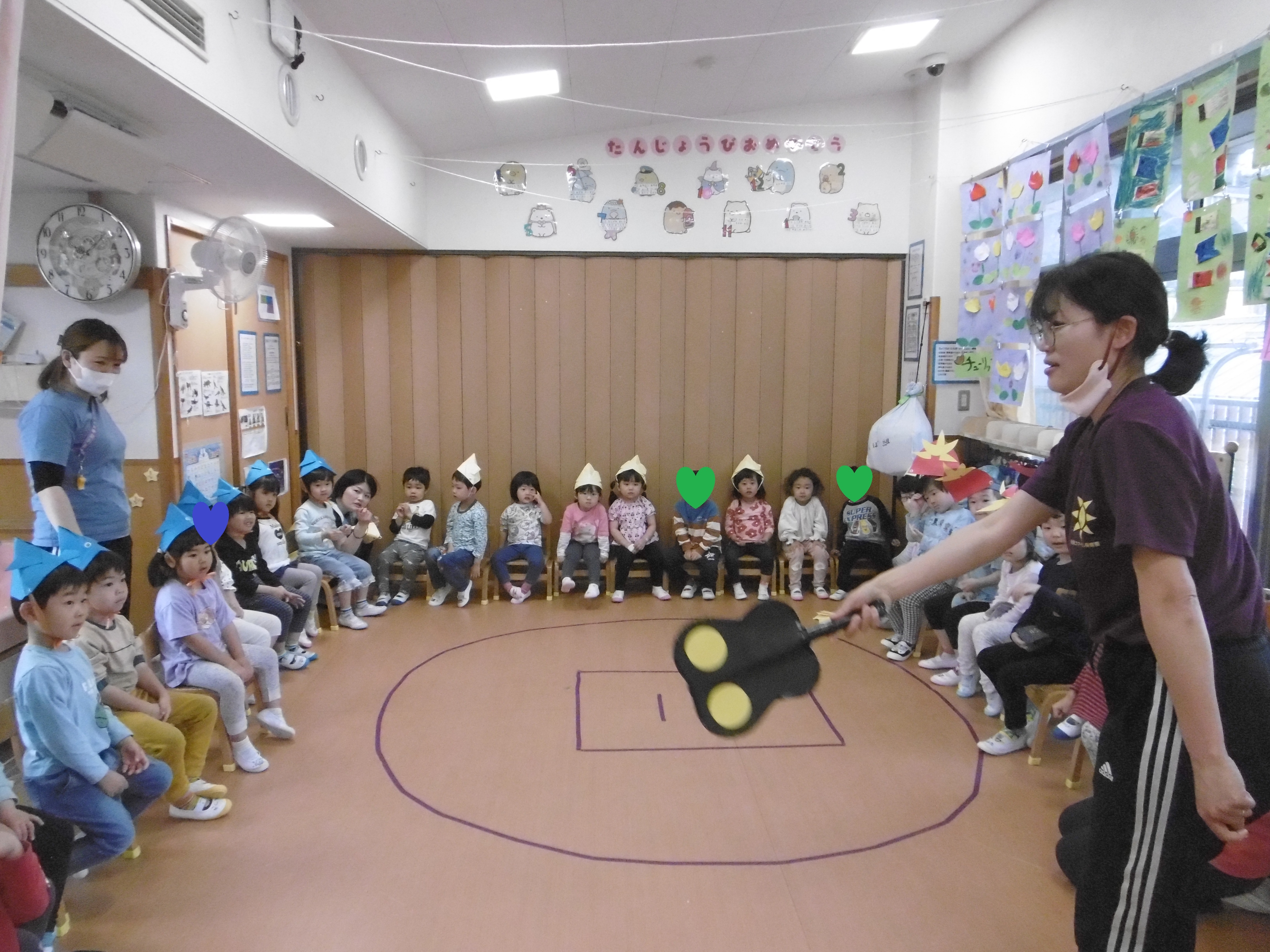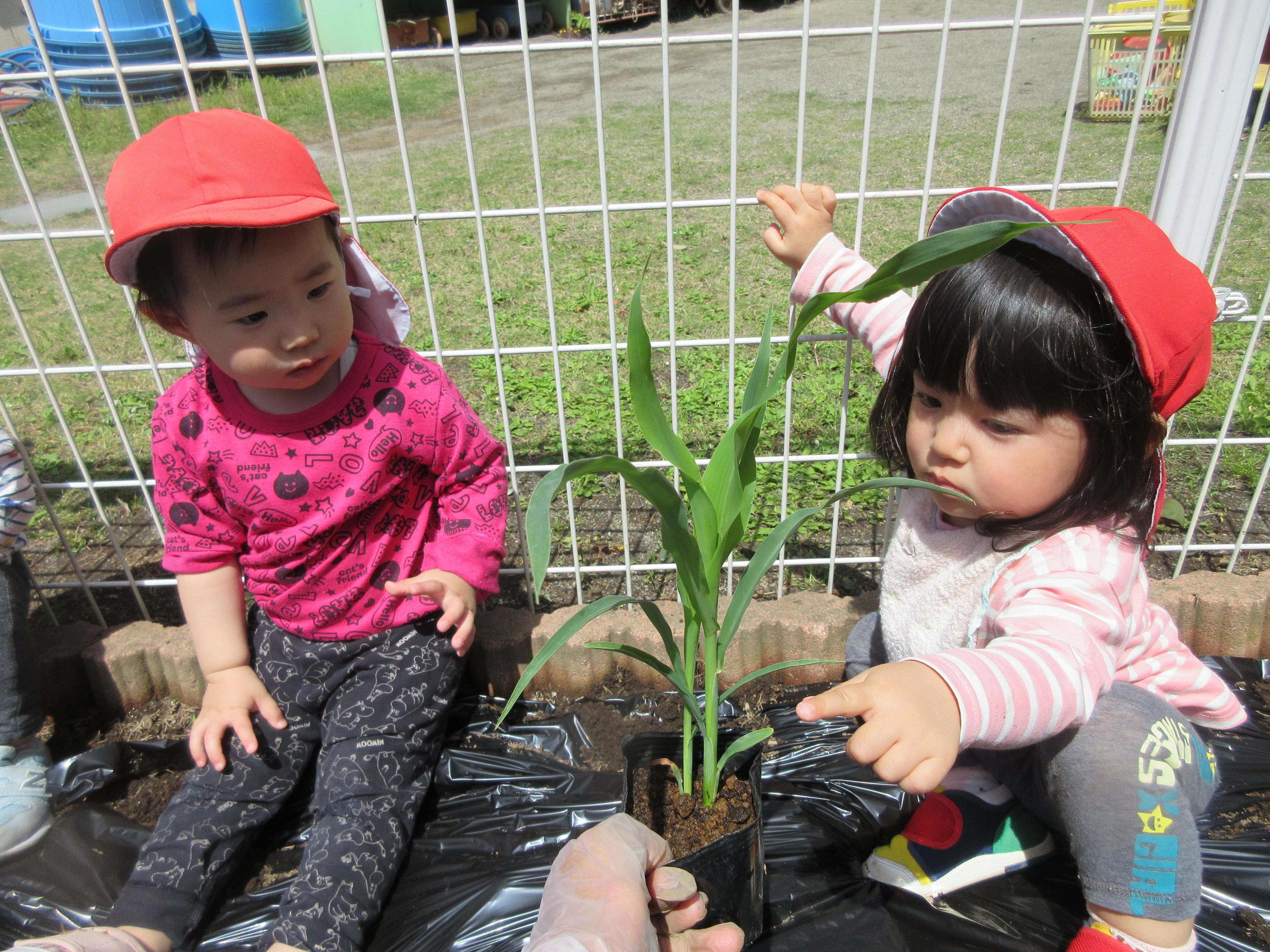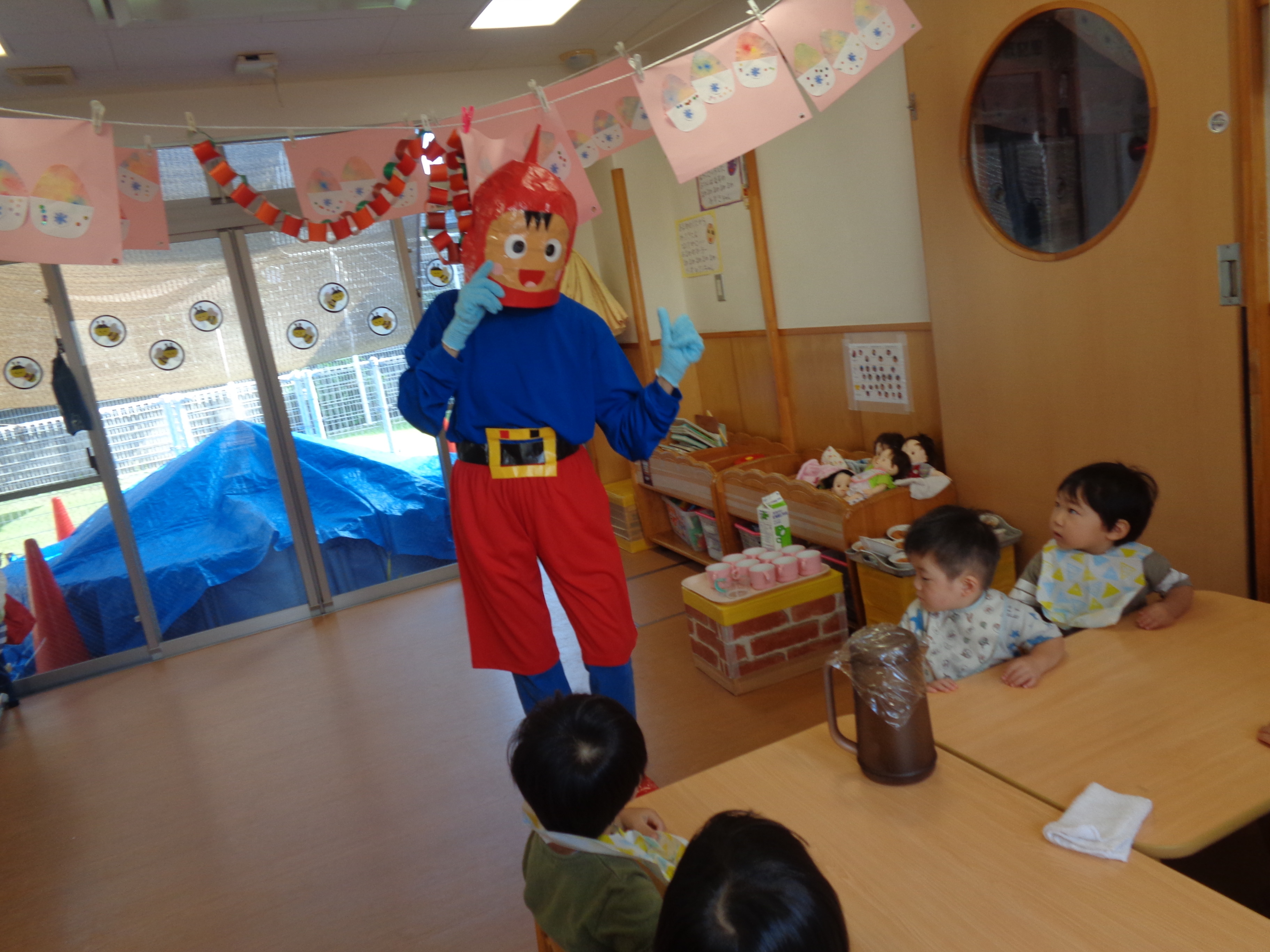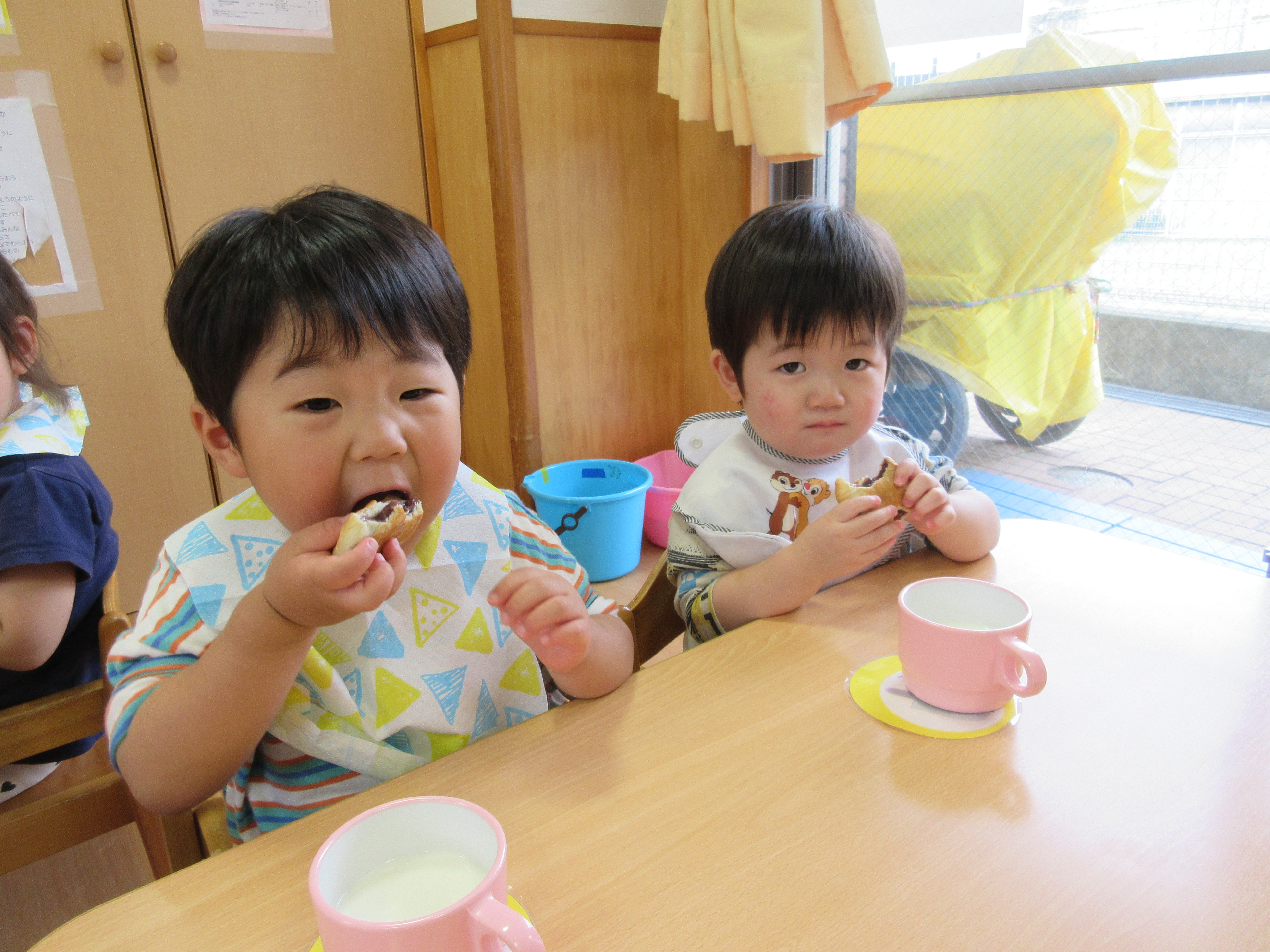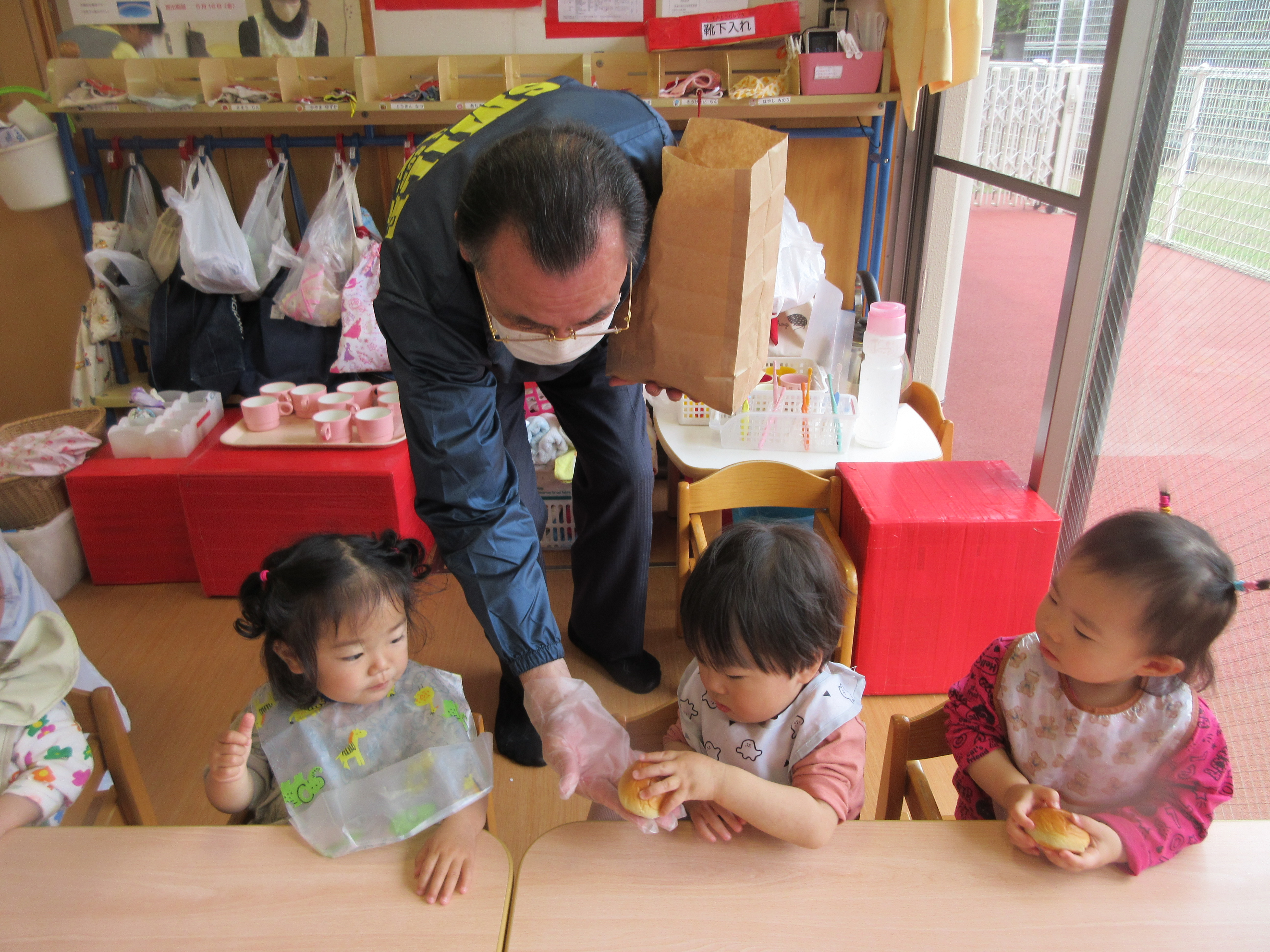 「コーンちゃん」は子どもたちに1本ずつとうもろこしを持ってきてくれて、みんなで皮むき。午後のおやつでは焼きとうもろこしパーティーを楽しみました。「MJ君」はみんなで育てた野菜を使ったミックスジュースを作ってくれて、みんなで乾杯!「大豆のだいちゃん」はお味噌の天地返しのためにお豆の国から来てくれて、匂いを嗅いだり、感触を確かめたりして完成への期待が膨らみました。
