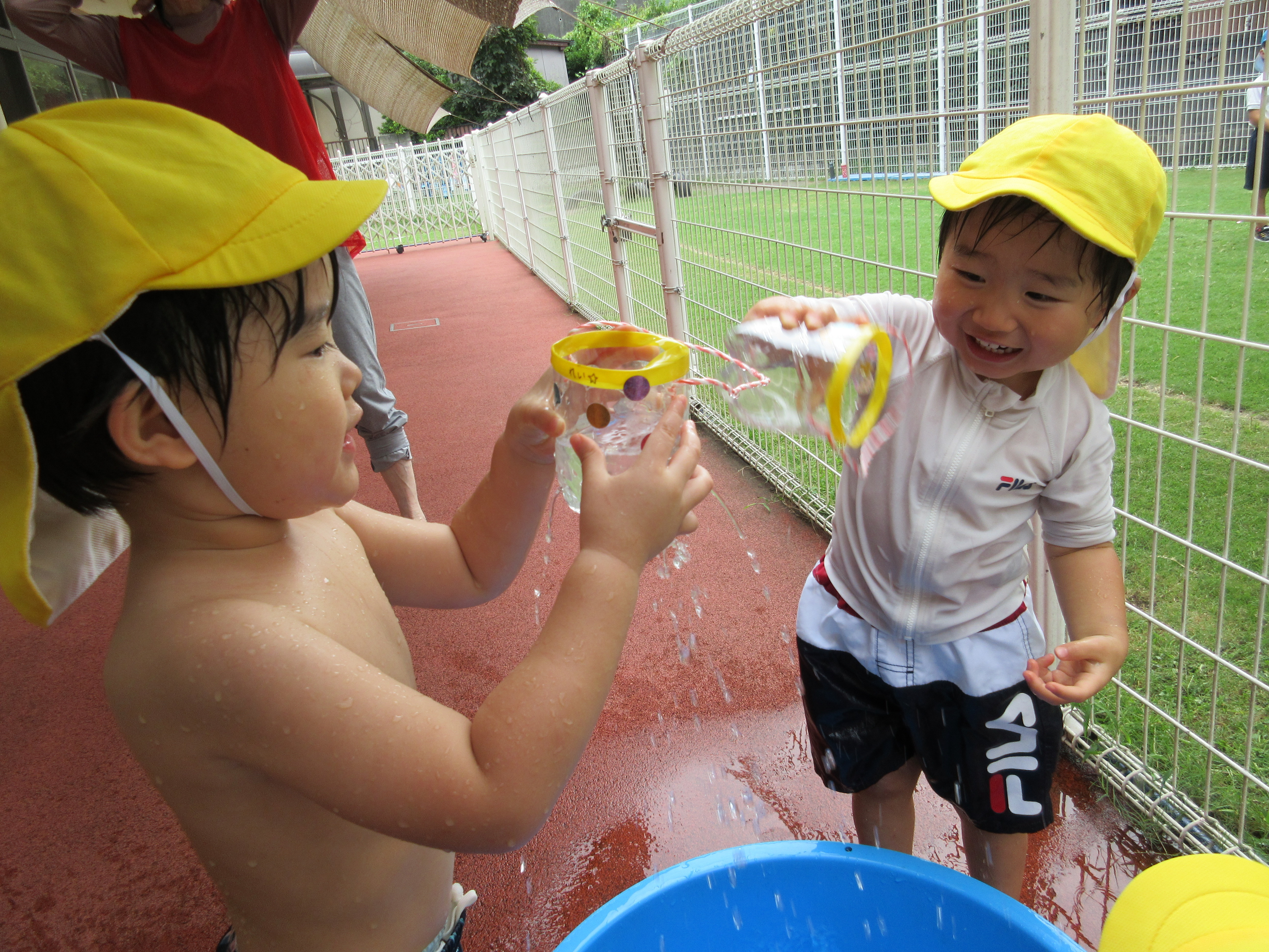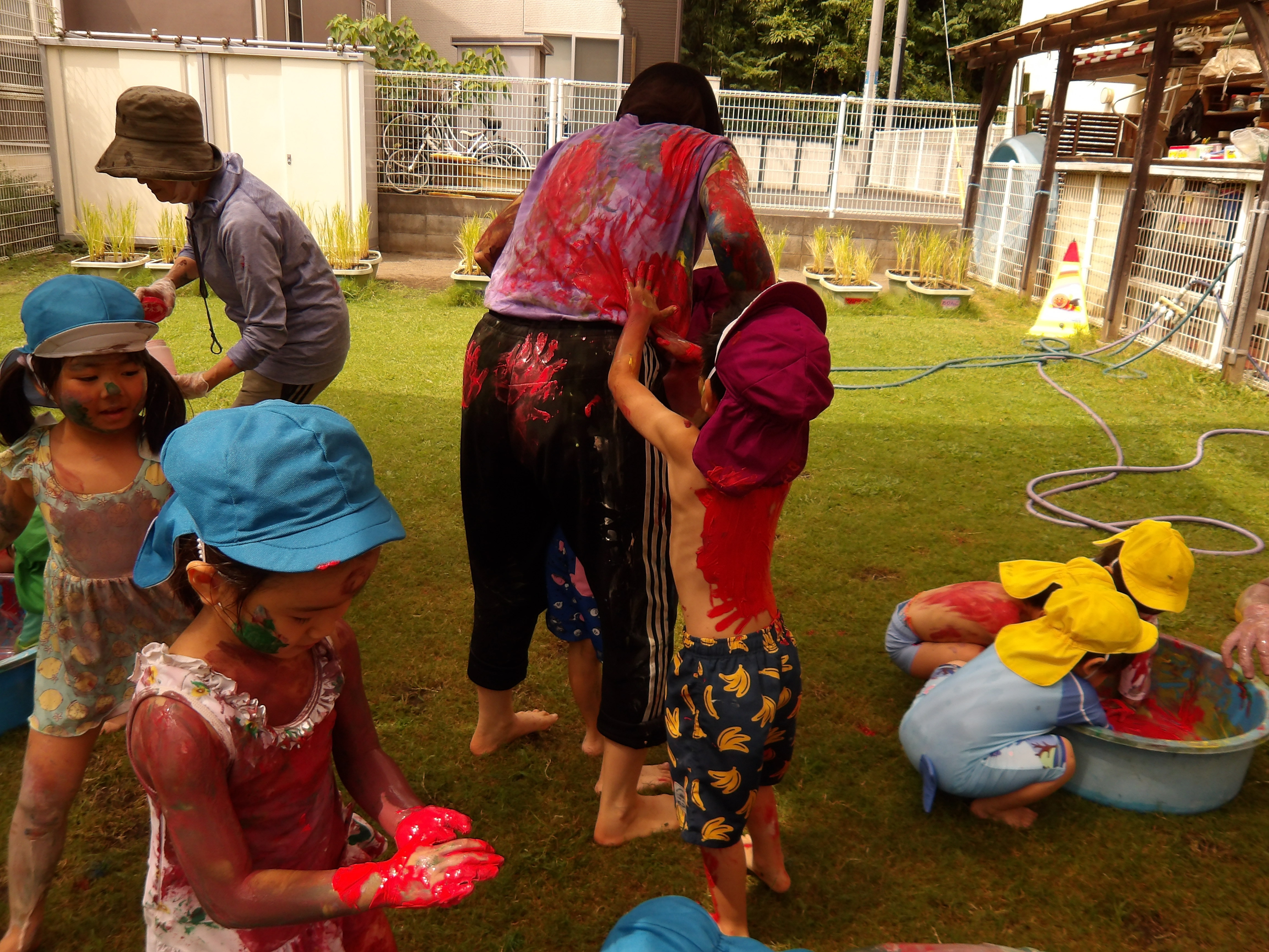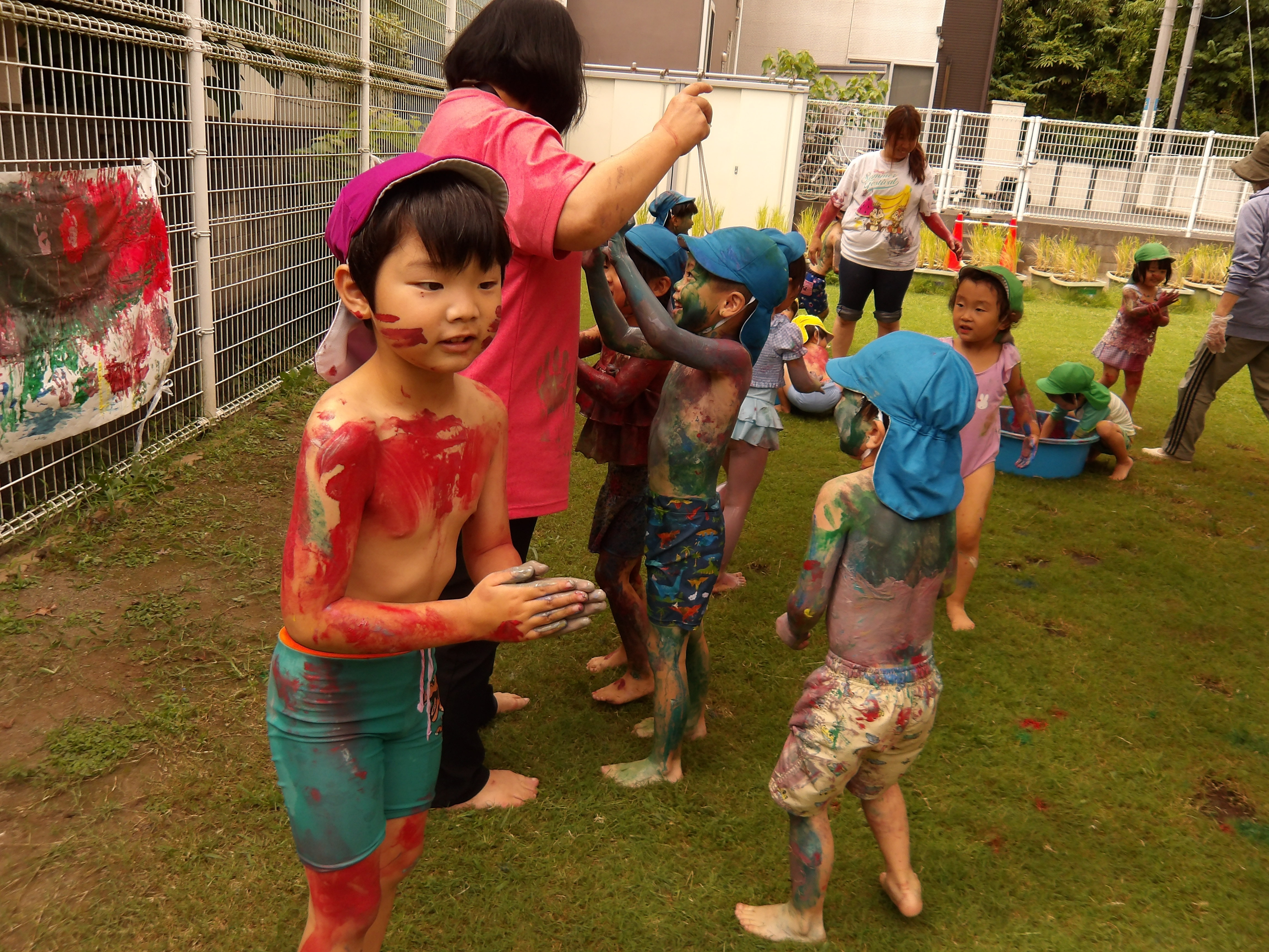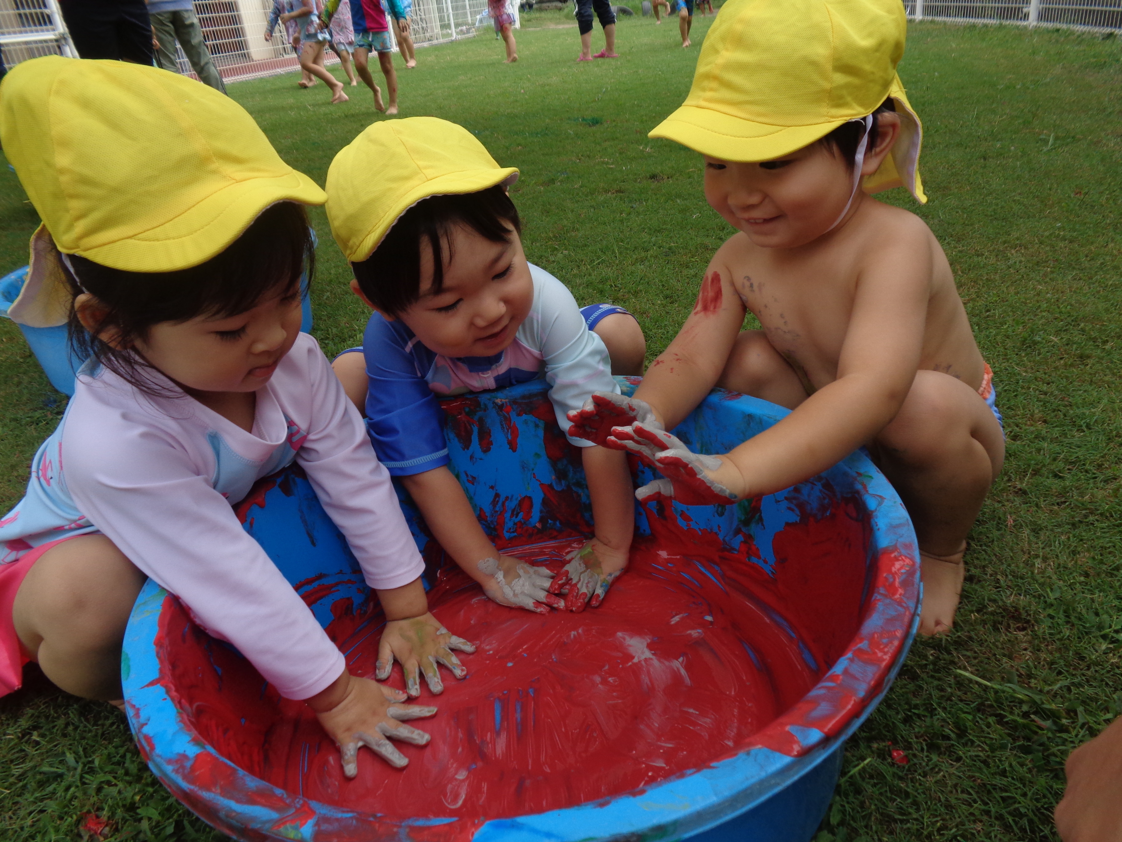 プール、水遊び、泥んこ遊び、寒天遊び、色水遊び、シャボン玉、フィンガーペインティング、ボディペインティングなどなど、子どもたちの笑顔がたくさん見られましたよ。